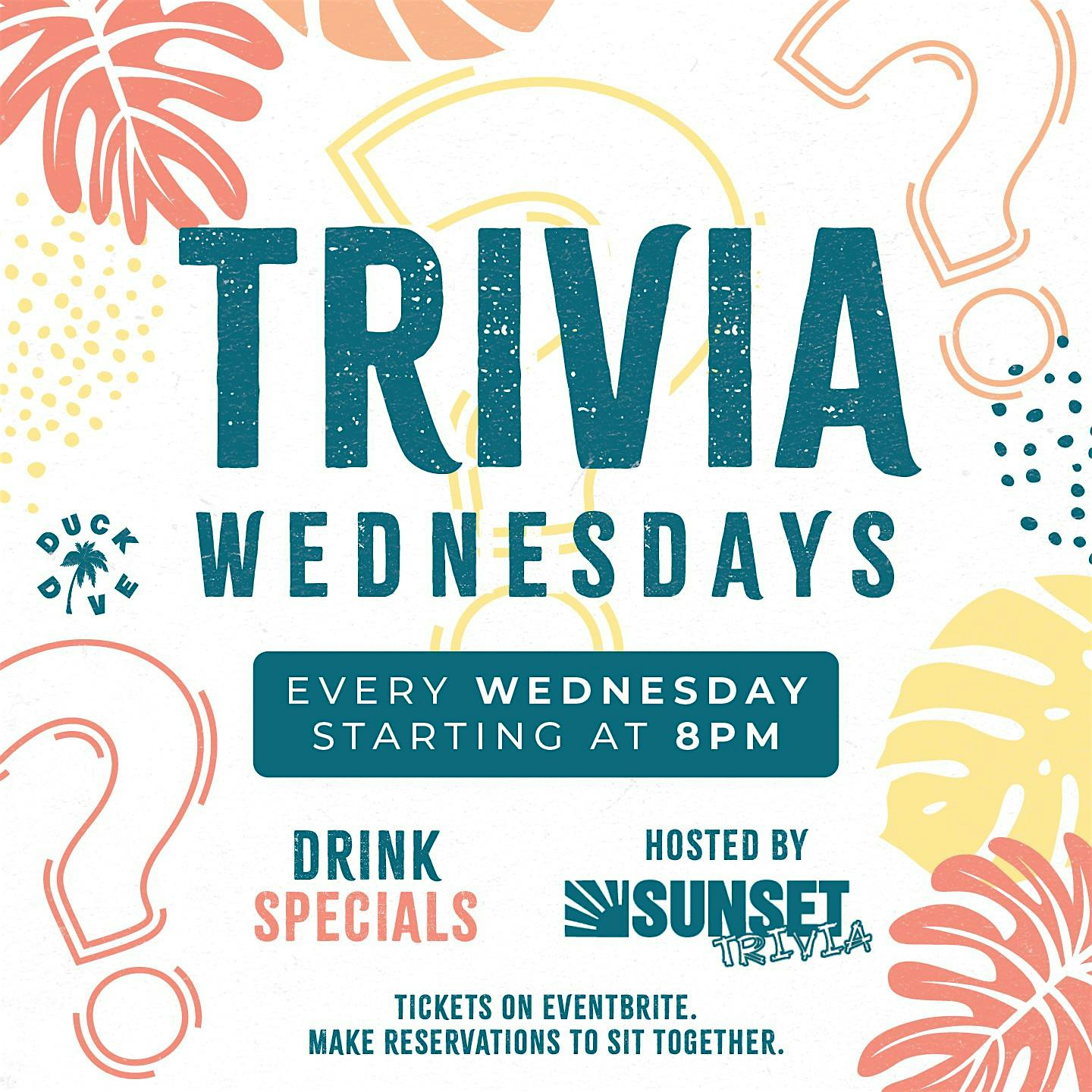 by admin27Feb Trivia at The Duck Dive at The Duck Dive – San Diego, CA Trivia at The Duck Dive at The Duck Dive – San Diego, CA 3 3 people viewed this event. The Duck Dive x Sunset Trivia host the most fun trivia nights in all of PB! Between drink specials and theme nights, you don’t wanna miss it Tickets-RSVP Link Date And Time Wednesday, April 15th, 2026 @ 08:00 PM Location 4650 Mission Boulevard, San Diego, CA 92109 Event Types Food & Drink Event Category CaliforniaSan Diego Share With Friends Facebook Twitter Linkedin Xing Pinterest Share This Post: