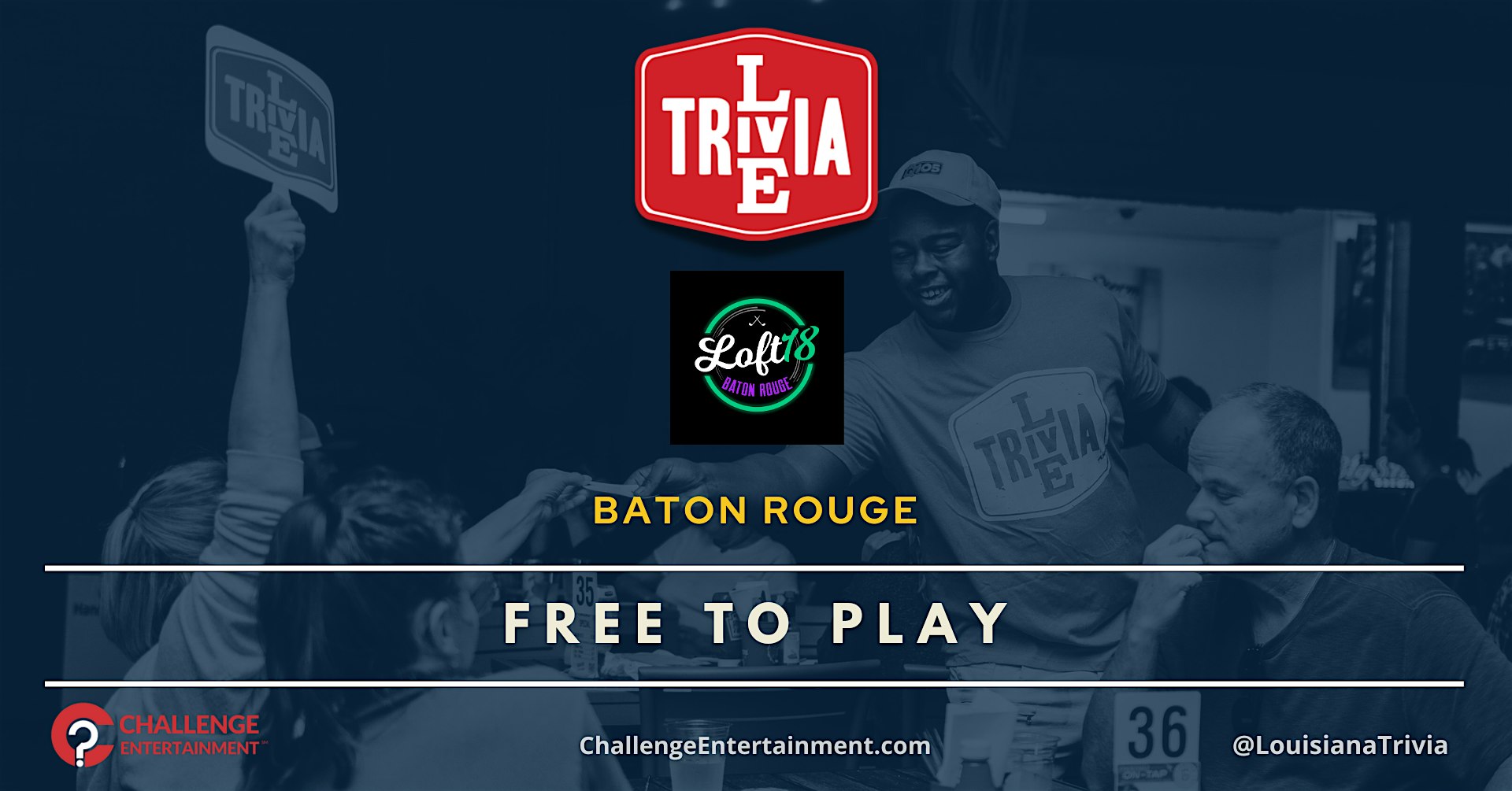 Weekly Live Trivia Nights at Loft 18 – Baton Rouge at Loft18 Baton Rouge – Baton Rouge, LA Weekly Live Trivia Nights at Loft 18 – Baton Rouge at Loft18 Baton Rouge – Baton Rouge, LA 1 1 people viewed this event. Live Trivia Nights at Loft 18 – Baton Rouge Tickets-RSVP Link Register for event Date And Time Wednesday, April 15th, 2026 @ 07:00 PM Location 4580 Constitution Avenue, Baton Rouge, LA 70808 Event Types Food & DrinkGame or Competition Event Category Baton RougeLouisiana Share With Friends Facebook Twitter Linkedin Xing Pinterest