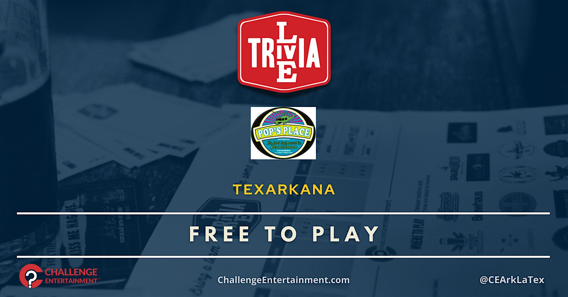 Weekly Live Trivia Nights at Pop’s Place – Texarkana at Pops Place – Texarkana, AR Weekly Live Trivia Nights at Pop’s Place – Texarkana at Pops Place – Texarkana, AR 1 1 people viewed this event. Weekly Live Trivia Nights at Pop’s Place – Texarkana Tickets-RSVP Link Register for event Date And Time Wednesday, April 15th, 2026 @ 07:00 PM Location 6701 U.S. 67, Texarkana, AR 71854 Event Types Food & DrinkGame or Competition Event Category Arkansas Share With Friends Facebook Twitter Linkedin Xing Pinterest