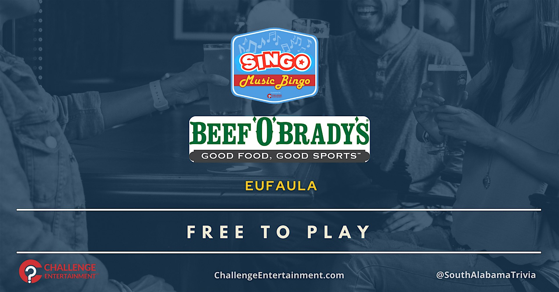 Weekly SINGO Bingo Nights at Beef ‘O’ Brady’s – Eufaula at Beef ‘O’ Brady’s – Eufaula, AL Weekly SINGO Bingo Nights at Beef ‘O’ Brady’s – Eufaula at Beef ‘O’ Brady’s – Eufaula, AL 1 1 people viewed this event. Beef ‘O’ Brady’s – Eufaula – Singo – Wednesday – 7:00 PM Tickets-RSVP Link Register for event Date And Time Wednesday, April 15th, 2026 @ 07:00 PM Location 1229 North Eufaula Avenue, Eufaula, AL 36027 Event Types Food & DrinkGame or Competition Event Category Alabama Share With Friends Facebook Twitter Linkedin Xing Pinterest