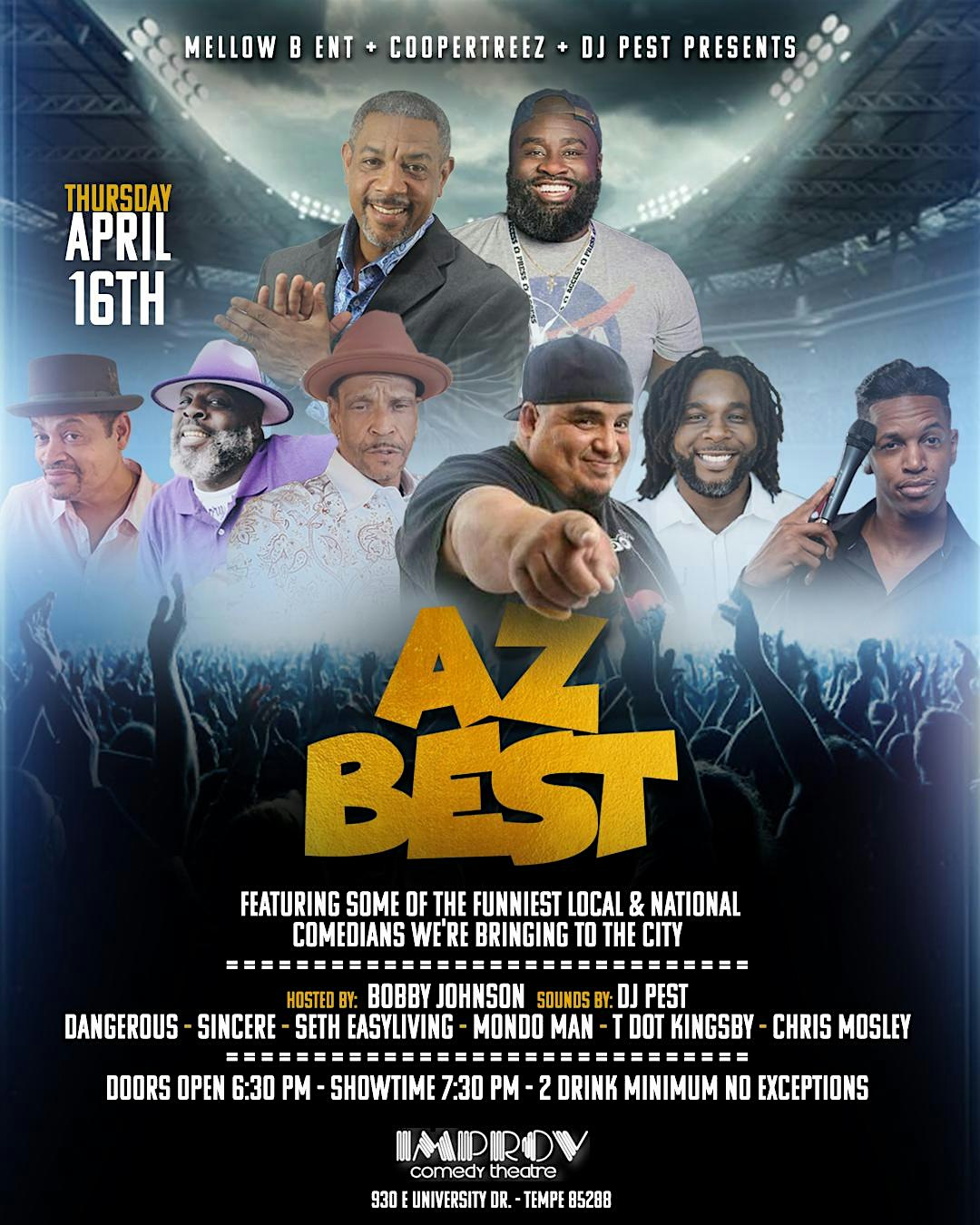 AZ BEST COMEDY at Tempe Improv – Tempe, AZ AZ BEST COMEDY at Tempe Improv – Tempe, AZ 3 3 people viewed this event. AZs Best Comedy Vol. 1 A brand-new comedy series is coming to Tempe! MellowB Entertainment, CooperTreez, and DJ Pest are bringing Tickets-RSVP Link Register for event Date And Time Thursday, April 16th, 2026 @ 06:00 PM Location 930 East University Drive, Tempe, AZ 85281 Event Types Party or Social GatheringPerforming & Visual Arts Event Category ArizonaTempe Share With Friends Facebook Twitter Linkedin Xing Pinterest