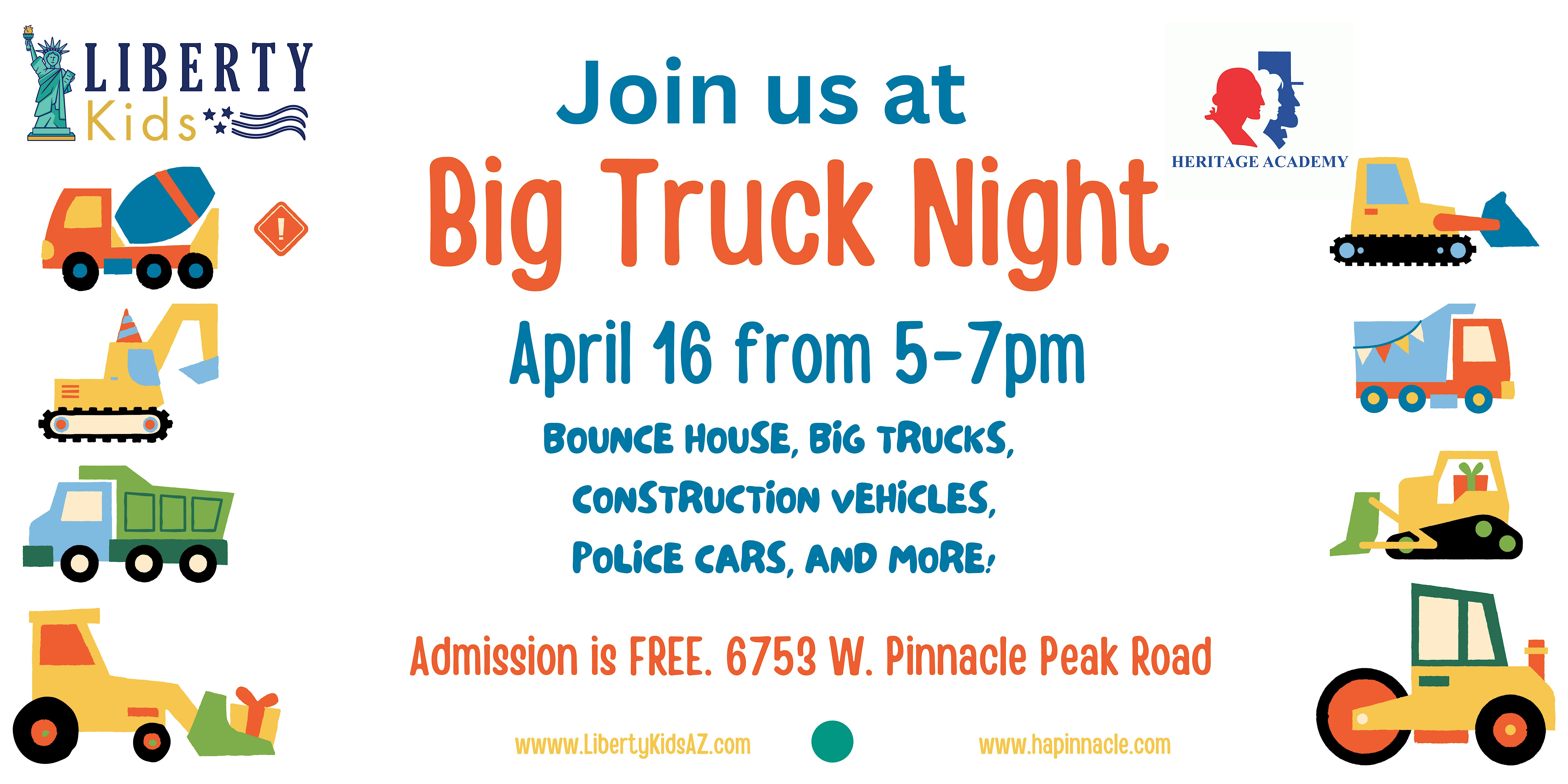 by admin27Feb Big Truck Night @ Heritage Academy Pinnacle at 6753 W Pinnacle Peak Rd – Glendale, AZ Big Truck Night @ Heritage Academy Pinnacle at 6753 W Pinnacle Peak Rd – Glendale, AZ 2 2 people viewed this event. Join us for Big Truck Night full of bounce houses, construction vehicles, big trucks and more! Tickets-RSVP Link Date And Time Thursday, April 16th, 2026 @ 05:00 PM Location 6753 West Pinnacle Peak Road, Glendale, AZ 85310 Event Types Party or Social Gathering Event Category ArizonaPhoenix Share With Friends Facebook Twitter Linkedin Xing Pinterest Share This Post: