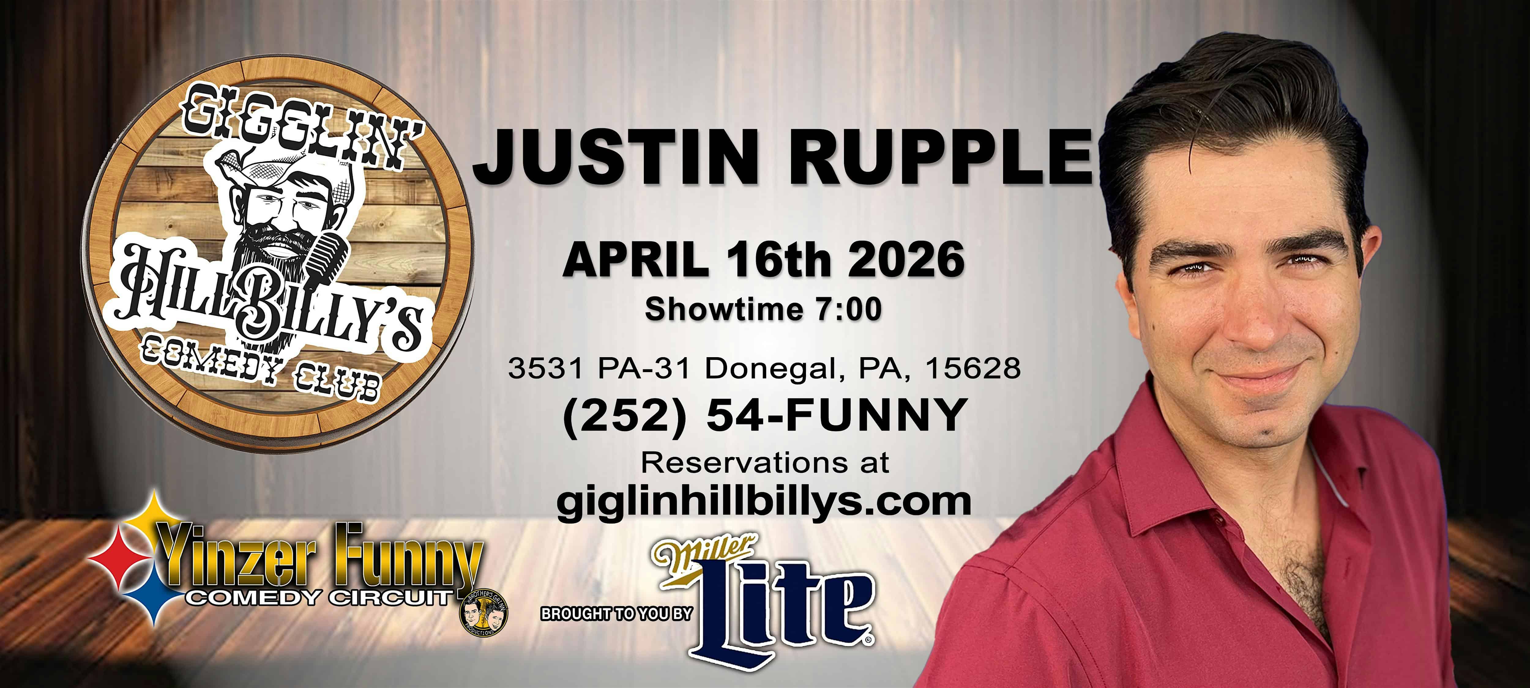 by admin14Feb JUSTIN RUPPLE – Gigglin’ Hill Billy’s Comedy Club at HillBilly’s Grub & Pub – Donegal, PA JUSTIN RUPPLE – Gigglin’ Hill Billy’s Comedy Club at HillBilly’s Grub & Pub – Donegal, PA 1 1 people viewed this event. Hollywood Funnies with how to train your Dragon Star – Justin Rupple at Gigglin’ Hill BIlly’s Comedy Club in Donegal, PA – April 16, 2025 Tickets-RSVP Link Date And Time Thursday, April 16th, 2026 11:00 PM (PST) Venue HillBilly's Grub & Pub Location 3531 Pennsylvania 31, Donegal, PA 15628 Event Types Concert or PerformancePerforming & Visual Arts Event Category Pennsylvania Share With Friends Facebook Twitter Linkedin Xing Pinterest Share This Post: