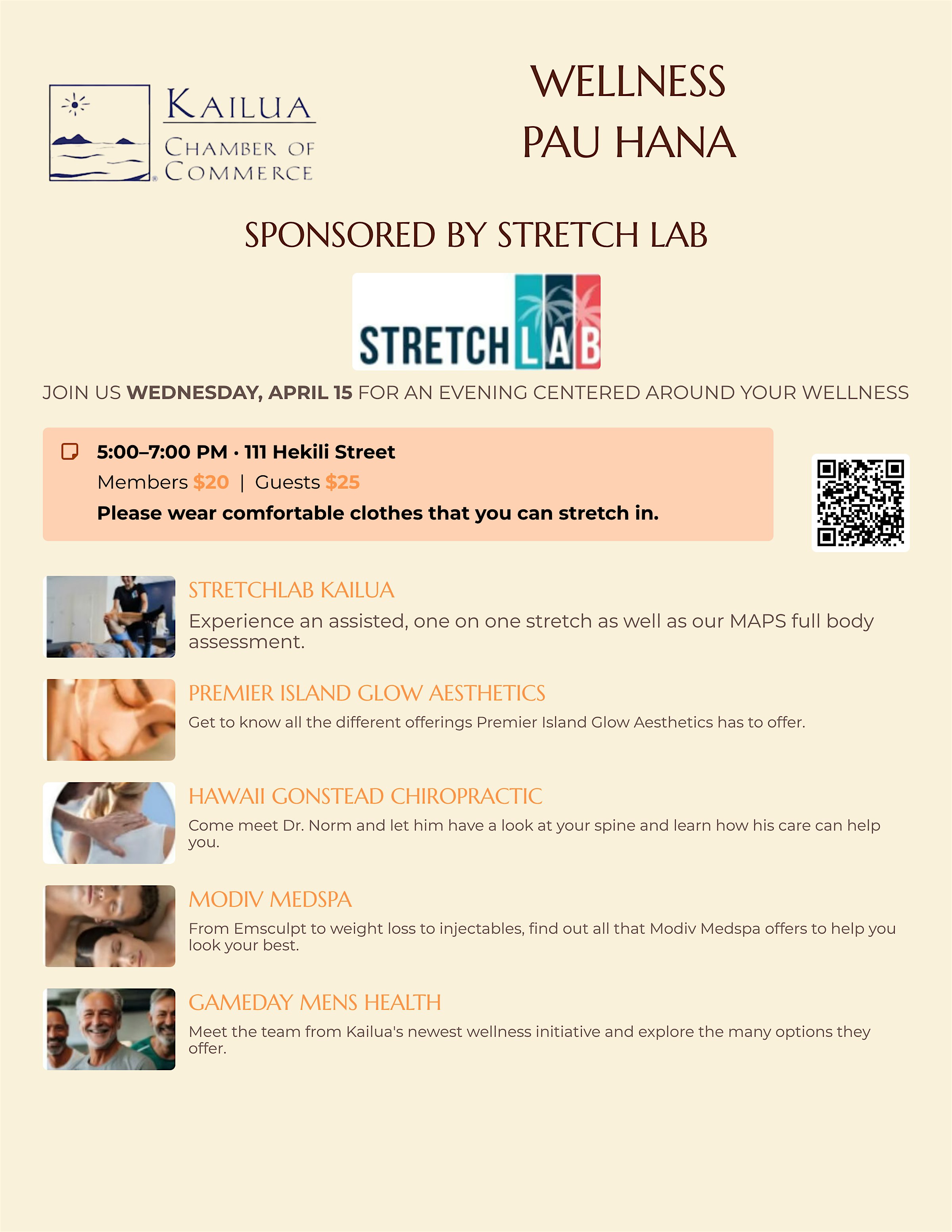 KCOC WELLNESS PAU HANA at StretchLab – Kailua, HI KCOC WELLNESS PAU HANA at StretchLab – Kailua, HI 1 1 people viewed this event. KCOC | April 15 — One evening. Your wellness. Remarkable local businesses. Good people. Don’t miss it. Tickets-RSVP Link Register for event Date And Time Thursday, April 16th, 2026 @ 05:00 PM Location 111 Hekili Street, Kailua, HI 96734 Event Types OtherParty or Social Gathering Event Category HawaiiHonolulu Share With Friends Facebook Twitter Linkedin Xing Pinterest