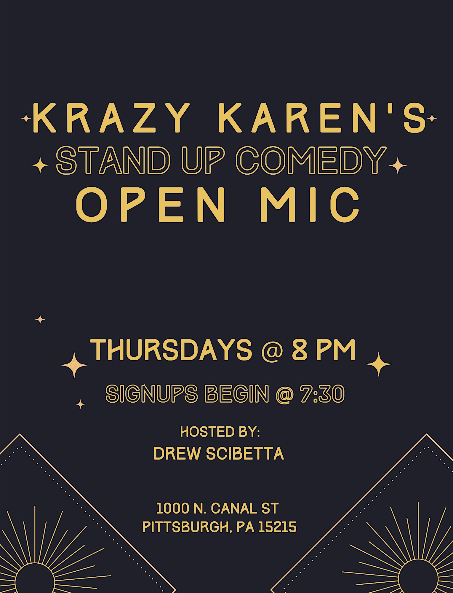 Krazy Karen’s Standup Comedy Open Mic at Krazy Karen’s – Pittsburgh, PA Krazy Karen’s Standup Comedy Open Mic at Krazy Karen’s – Pittsburgh, PA 3 3 people viewed this event. Weekly standup comedy open mic in the heart of Sharpsburg. Admission is FREE and the beers cheap. Hosted by Drew Scibetta (@ian_hode on IG) Tickets-RSVP Link Register for event Date And Time Thursday, April 16th, 2026 @ 08:00 PM Location 1000 North Canal Street, Pittsburgh, PA 15215 Event Types Concert or PerformancePerforming & Visual Arts Event Category PennsylvaniaPittsburgh Share With Friends Facebook Twitter Linkedin Xing Pinterest