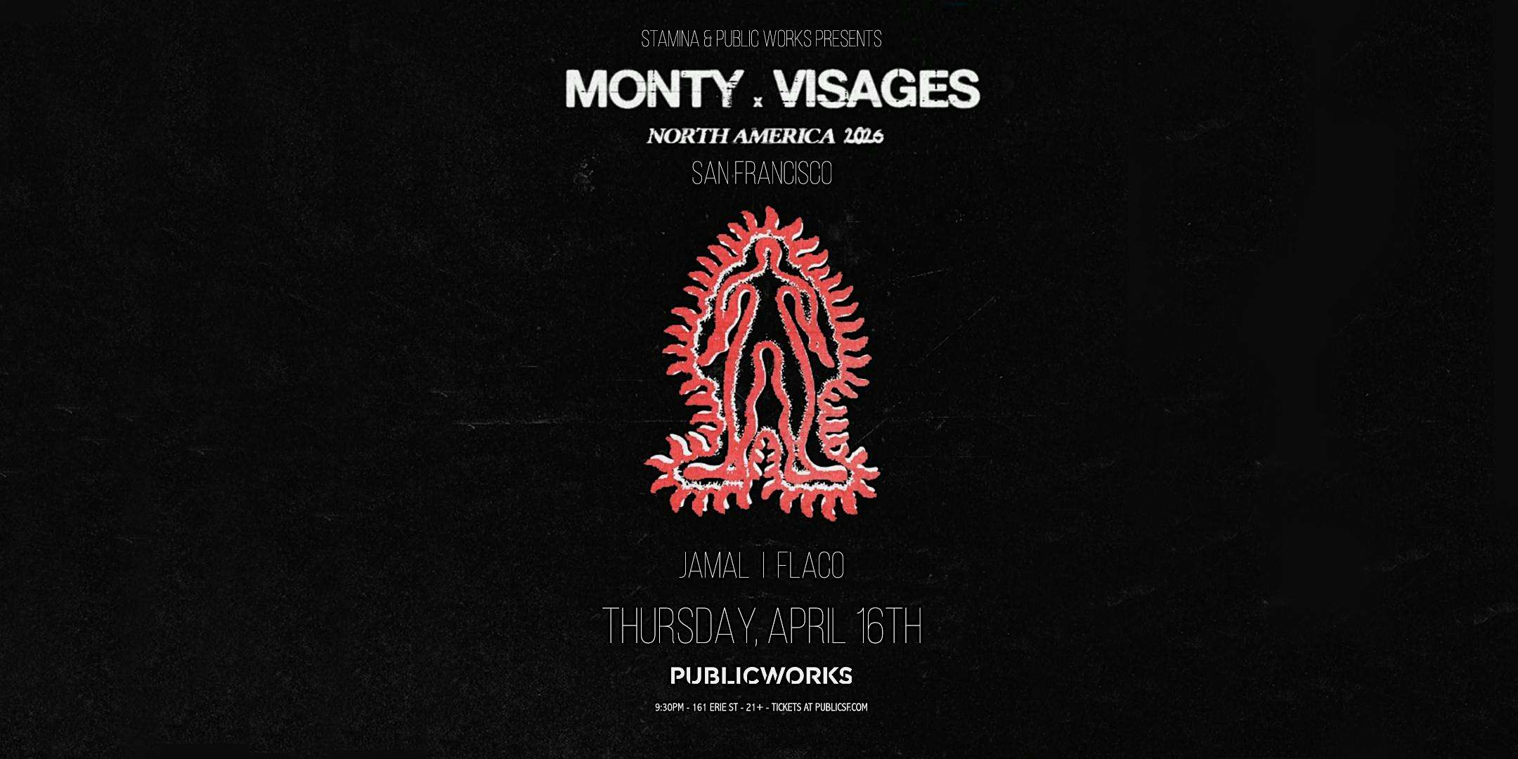 by admin24Feb Monty & Visages presented by Public Works & Stamina at Public Works – San Francisco, CA Monty & Visages presented by Public Works & Stamina at Public Works – San Francisco, CA 3 3 people viewed this event. Monty & Visages presented by Public Works & Stamina Tickets-RSVP Link Date And Time Thursday, April 16th, 2026 09:00 PM (PST) Venue Public Works Location 161 Erie Street, San Francisco, CA 94103 Event Types Concert or PerformanceMusic Event Category CaliforniaSan Francisco Share With Friends Facebook Twitter Linkedin Xing Pinterest Share This Post:
