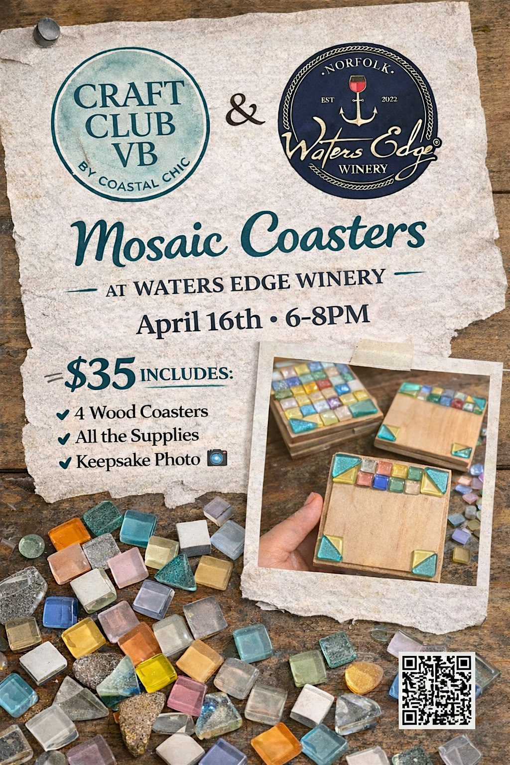 by admin24Feb Mosaic Coasters- Waters Edge Winery at Waters Edge Winery & Bistro Norfolk – Norfolk, VA Mosaic Coasters- Waters Edge Winery at Waters Edge Winery & Bistro Norfolk – Norfolk, VA 1 1 people viewed this event. Get creative and craft your own cool mosaic coasters while sipping on some great wine vibes. Tickets-RSVP Link Date And Time Thursday, April 16th, 2026 06:00 PM (PST) Venue Waters Edge Winery & Bistro Norfolk Location 6464 Hampton Boulevard, Norfolk, VA 23508 Event Types Food & Drink Event Category NorfolkVirginia Share With Friends Facebook Twitter Linkedin Xing Pinterest Share This Post: