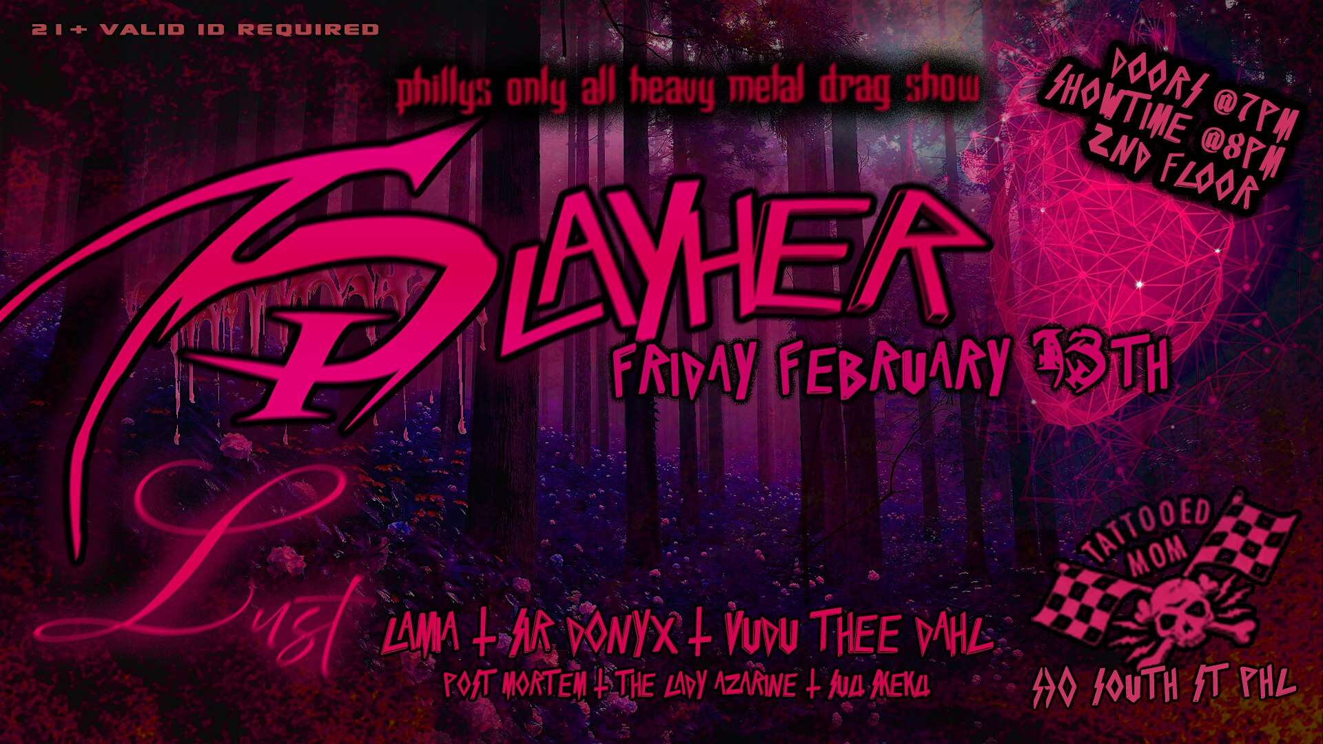 by admin14Feb SLAYHER: Philly’s Only All Heavy Metal Drag Show hosted by Lamia at Tattooed Mom – Philadelphia, PA SLAYHER: Philly’s Only All Heavy Metal Drag Show hosted by Lamia at Tattooed Mom – Philadelphia, PA 1 1 people viewed this event. After 7 years of sin, serves and slaying the runway, the metal queens of Philadelphia return for yet another year of stunts on South Street. Tickets-RSVP Link Date And Time Thursday, April 16th, 2026 11:00 PM (PST) Venue Tattooed Mom Location 530 South St, Philadelphia, PA 19147 Event Types Concert or PerformancePerforming & Visual Arts Event Category PennsylvaniaPhiladelphia Share With Friends Facebook Twitter Linkedin Xing Pinterest Share This Post: