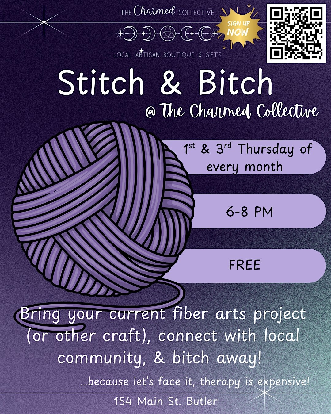 by admin13Feb Stitch & Bitch! at The Charmed Collective – Butler, NJ Stitch & Bitch! at The Charmed Collective – Butler, NJ 1 1 people viewed this event. Bring your current work in progress & join us for a night of crafting & venting! Tickets-RSVP Link Date And Time Thursday, April 16th, 2026 10:00 PM (PST) Venue The Charmed Collective Location 154 Main Street, Butler, NJ 7405 Event Types Party or Social Gathering Event Category New Jersey Share With Friends Facebook Twitter Linkedin Xing Pinterest Share This Post: