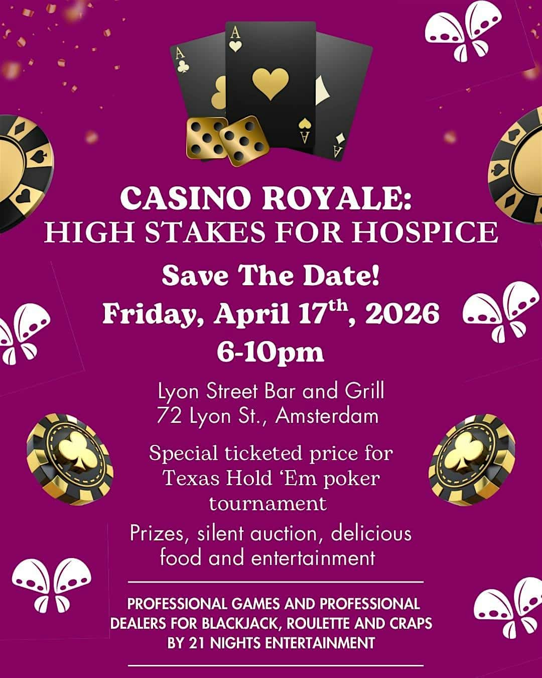 by admin14Feb Casino Royale: High Stakes for Hospice at Lyon Street Bar and Grill – Amsterdam, NY Casino Royale: High Stakes for Hospice at Lyon Street Bar and Grill – Amsterdam, NY 1 1 people viewed this event. Bet on a good cause! Enjoy a 007-inspired casino night where every chip supports Mountain Valley Hospice and Palliative Care! Tickets-RSVP Link Date And Time Friday, April 17th, 2026 10:00 PM (PST) Venue Lyon Street Bar and Grill Location 72 Lyon Street, Amsterdam, NY 12010 Event Types Charity & CausesParty or Social Gathering Event Category New York Share With Friends Facebook Twitter Linkedin Xing Pinterest Share This Post: