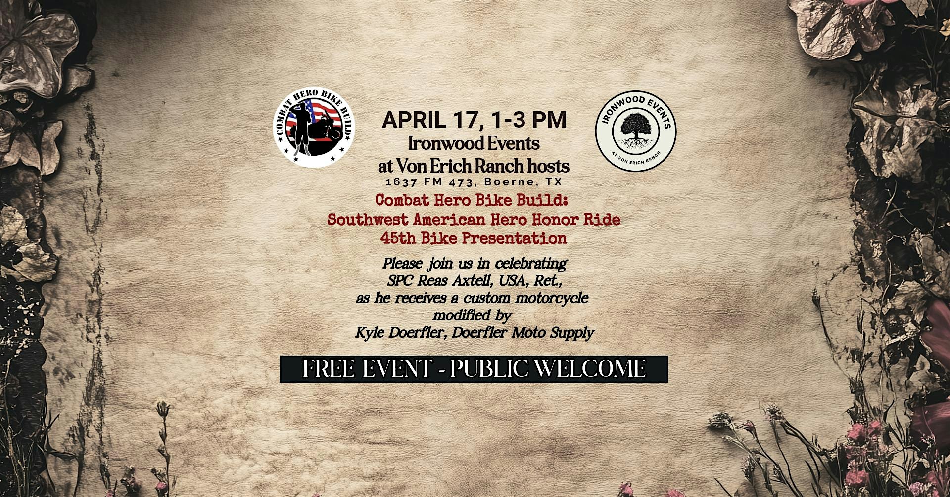 by admin27Feb Combat Hero Bike Build: Bike #45 Presentation at Ironwood Events at Von Erich Ranch – Boerne, TX Combat Hero Bike Build: Bike #45 Presentation at Ironwood Events at Von Erich Ranch – Boerne, TX 2 2 people viewed this event. Combat Hero Bike Build Bike #45 Presentation to SPC Reas Axtell, USA, Ret. Specially modified bike gifted to an American Hero! Tickets-RSVP Link Date And Time Friday, April 17th, 2026 @ 01:00 PM Location 1637 Ranch Road 473, Boerne, TX 78006 Event Types Charity & CausesParty or Social Gathering Event Category Texas Share With Friends Facebook Twitter Linkedin Xing Pinterest Share This Post: