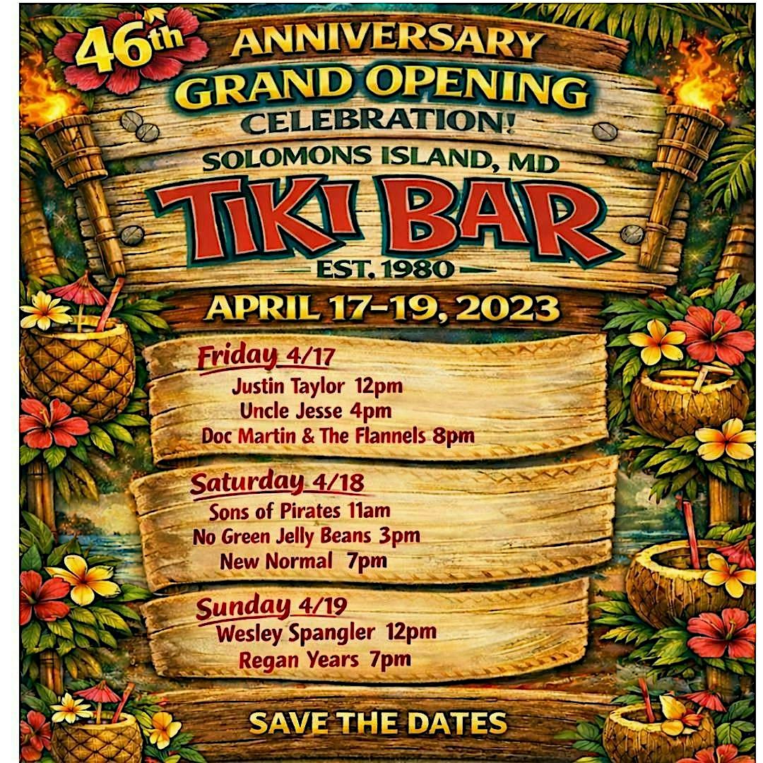by admin27Feb Grand Opening – FRIDAY ONLY at Tiki Bar Solomons Island – Solomons, MD Grand Opening – FRIDAY ONLY at Tiki Bar Solomons Island – Solomons, MD 2 2 people viewed this event. 46th Annual GRAND OPENING of Tiki Bar. This ticket is good for all the live music and activities on Friday 4/17/26. Tickets-RSVP Link Date And Time Friday, April 17th, 2026 @ 11:00 AM Location 85 Charles Street, Solomons, MD 20688 Event Types Concert or PerformanceMusic Event Category Maryland Share With Friends Facebook Twitter Linkedin Xing Pinterest Share This Post: