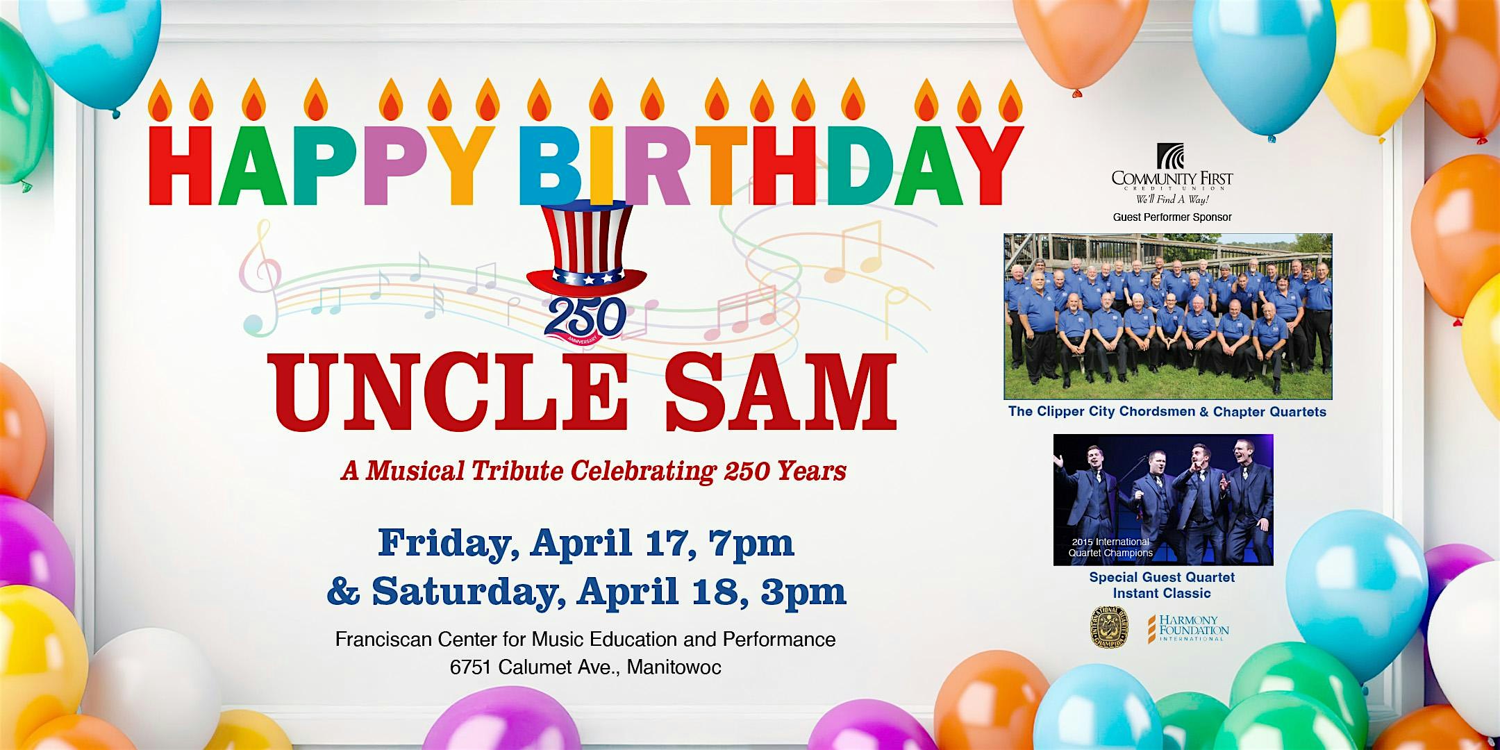 by admin24Feb Happy Birthday Uncle Sam at Franciscan Center for Music Education and Performance – Manitowoc, WI Happy Birthday Uncle Sam at Franciscan Center for Music Education and Performance – Manitowoc, WI 2 2 people viewed this event. The Clipper City Chordsmen are back for their 81st anniversary with a celebration of Uncle Sam’s 250th birthday! Tickets-RSVP Link Date And Time Friday, April 17th, 2026 07:00 PM (PST) Venue Franciscan Center for Music Education and Performance Location 6751 Calumet Avenue, Manitowoc, WI 54220 Event Types Concert or PerformanceMusic Event Category Wisconsin Share With Friends Facebook Twitter Linkedin Xing Pinterest Share This Post: