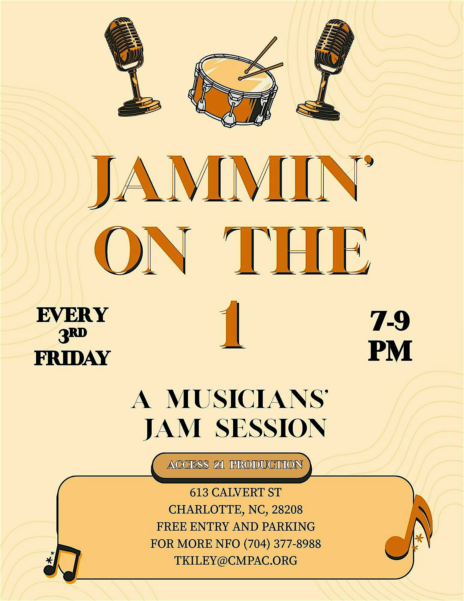 by admin24Feb Jammin’ on the 1 at Access 21 – Charlotte, NC Jammin’ on the 1 at Access 21 – Charlotte, NC 1 1 people viewed this event. Jammin’ on the 1 is a musicians’ jam session taking place at the Access 21 studios. Tickets-RSVP Link Date And Time Friday, April 17th, 2026 07:00 PM (PST) Venue Access 21 Location 613 Calvert Street, Charlotte, NC 28208 Event Types Concert or PerformanceMusic Event Category CharlotteNorth Carolina Share With Friends Facebook Twitter Linkedin Xing Pinterest Share This Post: