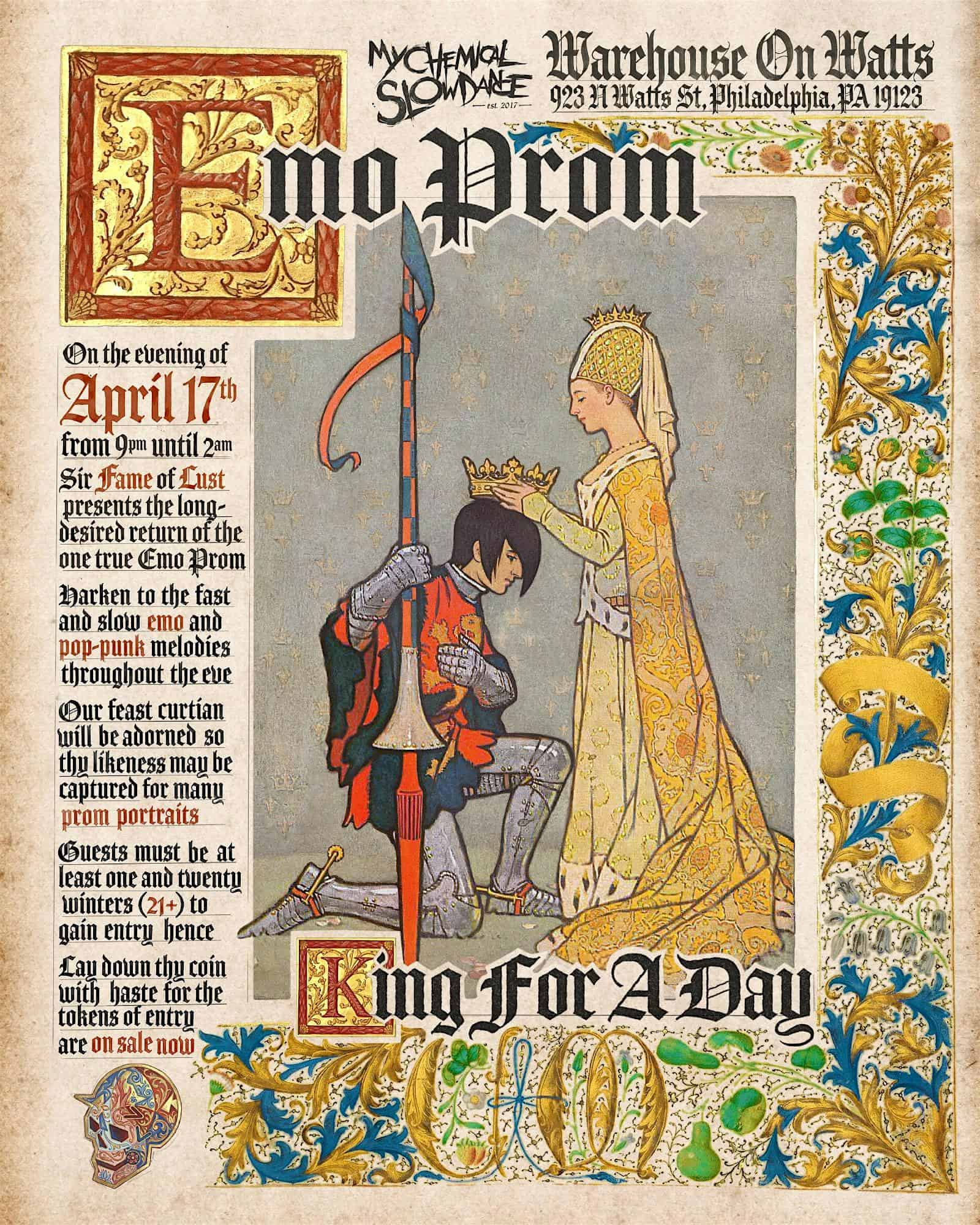 by admin23Feb My Chemical Slow Dance {Emo Prom}: “King For A Day” Edition at Warehouse on Watts | W.O.W. – Philadelphia, PA My Chemical Slow Dance {Emo Prom}: “King For A Day” Edition at Warehouse on Watts | W.O.W. – Philadelphia, PA 2 2 people viewed this event. Thou art invited to a gathering of most exquisite sorrow ~ Tickets-RSVP Link Date And Time Friday, April 17th, 2026 09:00 PM (PST) Venue Warehouse on Watts | W.O.W. Location 923 North Watts Street, Philadelphia, PA 19123 Event Types MusicParty or Social Gathering Event Category PennsylvaniaPhiladelphia Share With Friends Facebook Twitter Linkedin Xing Pinterest Share This Post: