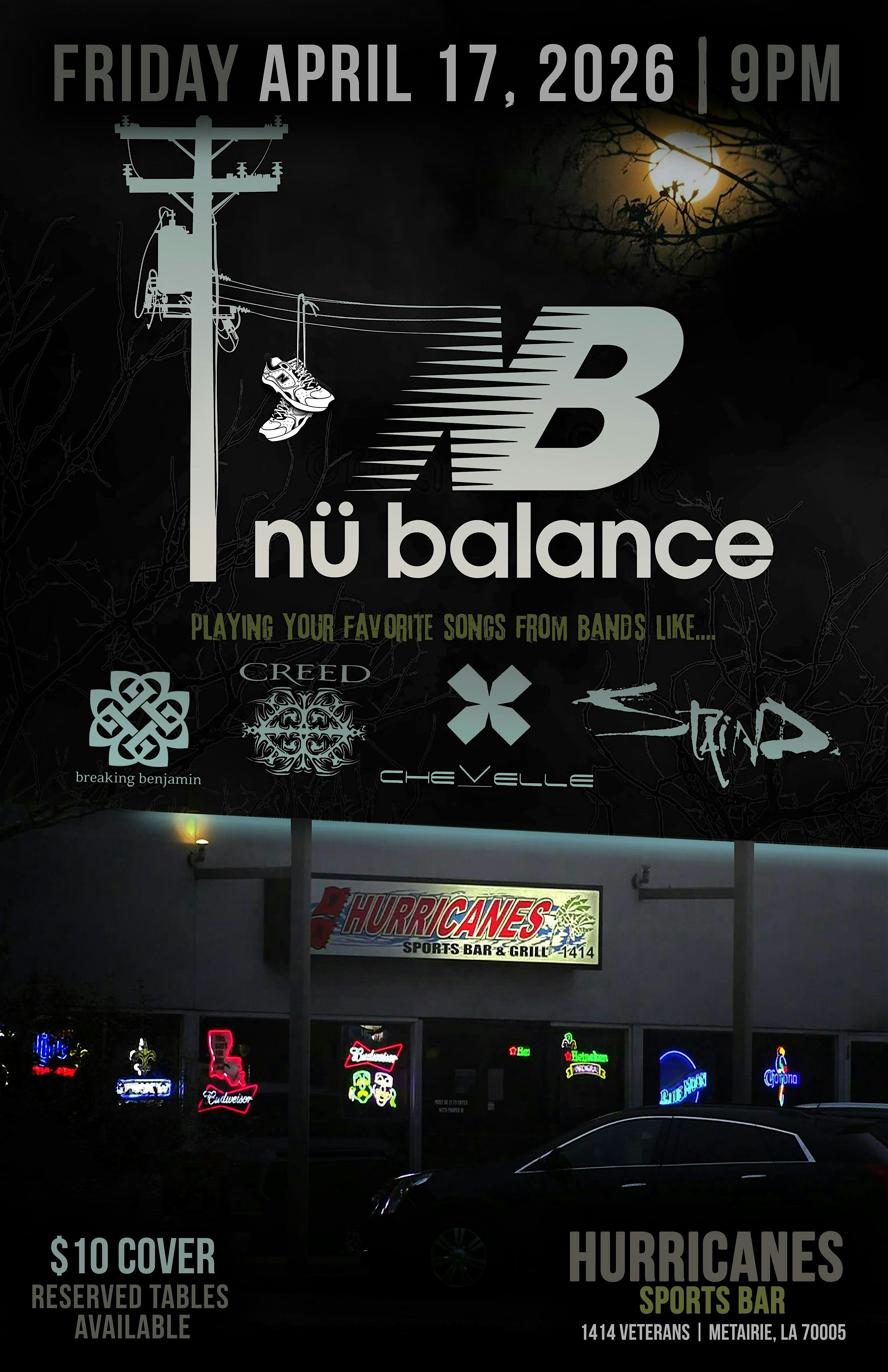by admin24Feb Nü Balance April 17th Reserved Seating at Hurricanes Sports Bar – Metairie, LA Nü Balance April 17th Reserved Seating at Hurricanes Sports Bar – Metairie, LA 2 2 people viewed this event. Purchase gets you a reserved table close to the stage and admission for one person. Tickets-RSVP Link Date And Time Friday, April 17th, 2026 09:00 PM (PST) Venue Hurricanes Sports Bar Location 1414 Veterans Memorial Boulevard, Metairie, LA 70005 Event Types Concert or PerformanceMusic Event Category LouisianaNew Orleans Share With Friends Facebook Twitter Linkedin Xing Pinterest Share This Post: