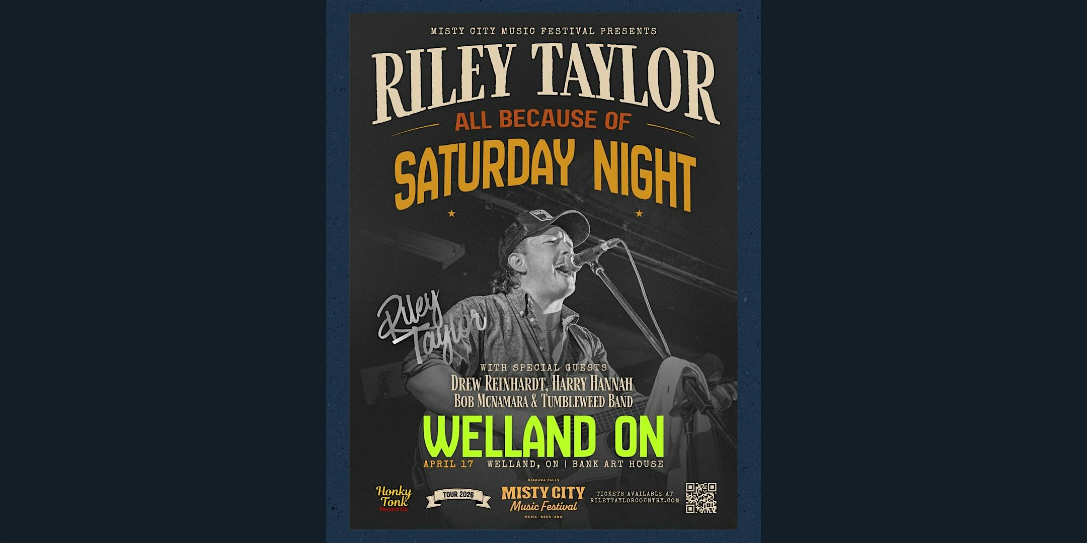 by admin13Feb Riley Taylor – All Because of Saturday Night Tour – Welland, ON. at 22 King St – Welland, Canada Riley Taylor – All Because of Saturday Night Tour – Welland, ON. at 22 King St – Welland, Canada 2 2 people viewed this event. Misty City Music Fest presents: The Riley Taylor – All Because of Saturday Night Tour at The Bank Art House, April 17th, 2026. Tickets-RSVP Link Date And Time Friday, April 17th, 2026 11:00 PM (PST) Venue 22 King St Location 22 King Street, Welland, Canada L3B 3H9 Event Types Concert or PerformanceMusic Event Category Canada Share With Friends Facebook Twitter Linkedin Xing Pinterest Share This Post: