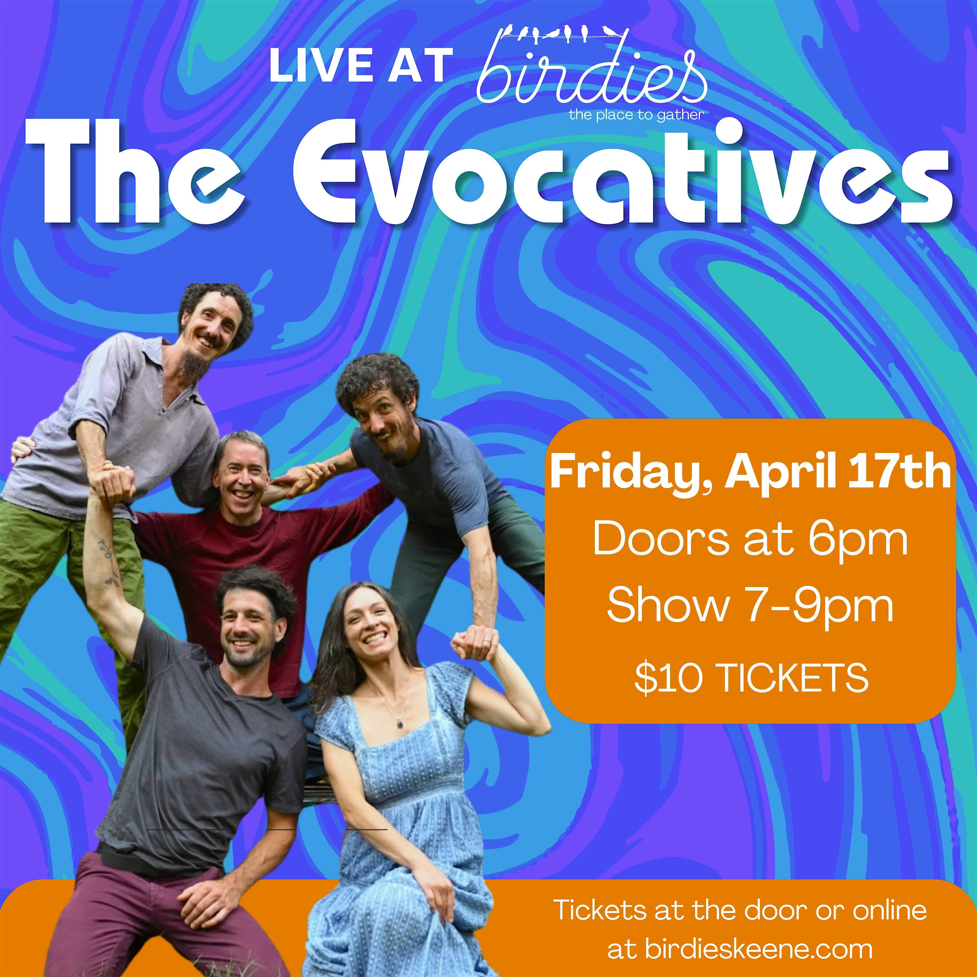 by admin14Feb The Evocatives- LIVE at Birdies! at Birdies – Keene, NH The Evocatives- LIVE at Birdies! at Birdies – Keene, NH 1 1 people viewed this event. Doors at 6pm, show 7-9pm Tickets-RSVP Link Date And Time Friday, April 17th, 2026 11:00 PM (PST) Venue Birdies Location 18 Main Street, Keene, NH 3431 Event Types Concert or PerformancePerforming & Visual Arts Event Category New Hampshire Share With Friends Facebook Twitter Linkedin Xing Pinterest Share This Post: