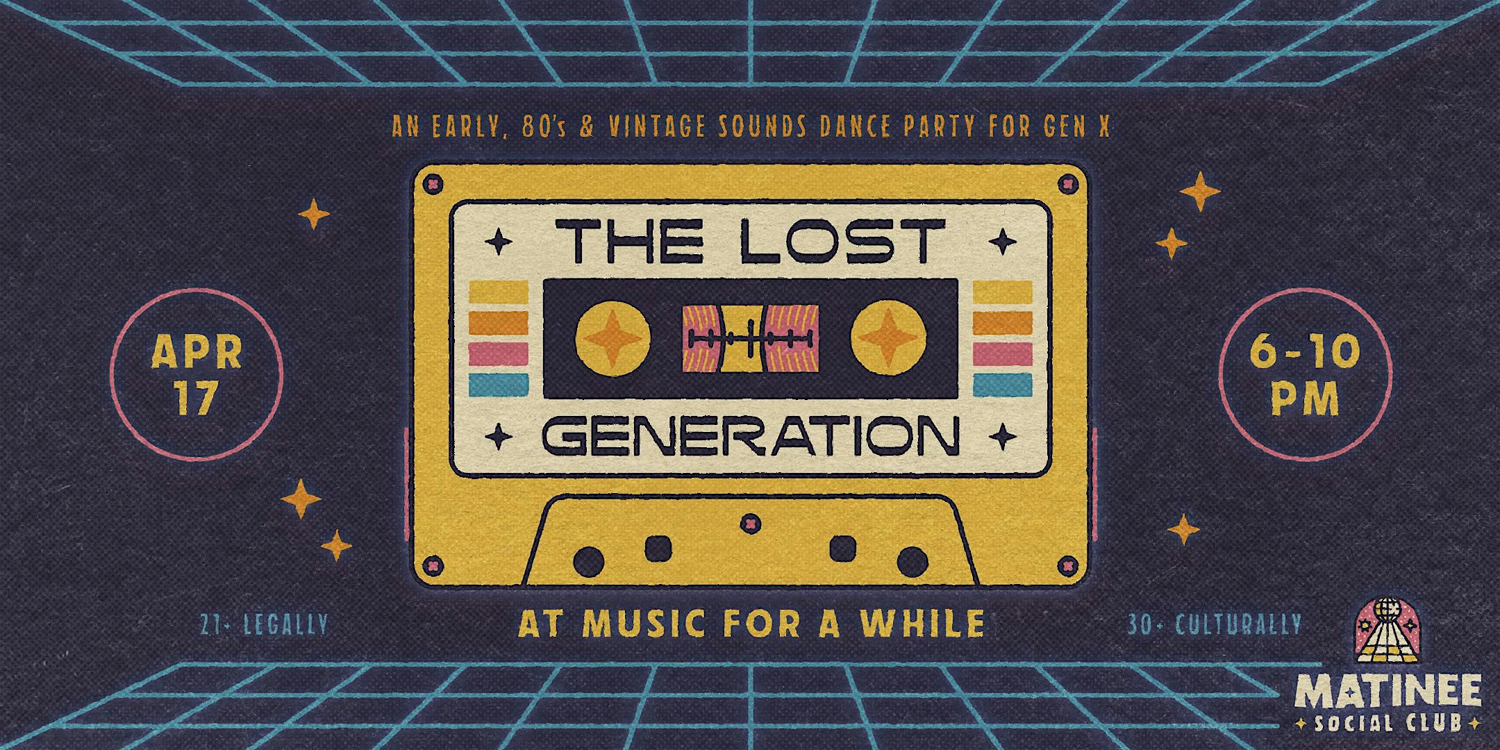 by admin27Feb The Lost Generation [80s + Gen X Matinee] at Music For A While – New York, NY The Lost Generation [80s + Gen X Matinee] at Music For A While – New York, NY 2 2 people viewed this event. An early, 80s & vintage sounds dance party with for Gen X – presented by Matinee Social Club @ Music for a While in Chelsea. Tickets-RSVP Link Date And Time Friday, April 17th, 2026 06:00 PM (PST) Venue Music For A While Location 518 West 27th Street, New York, NY 10001 Event Types MusicParty or Social Gathering Event Category New YorkNew York City Share With Friends Facebook Twitter Linkedin Xing Pinterest Share This Post: