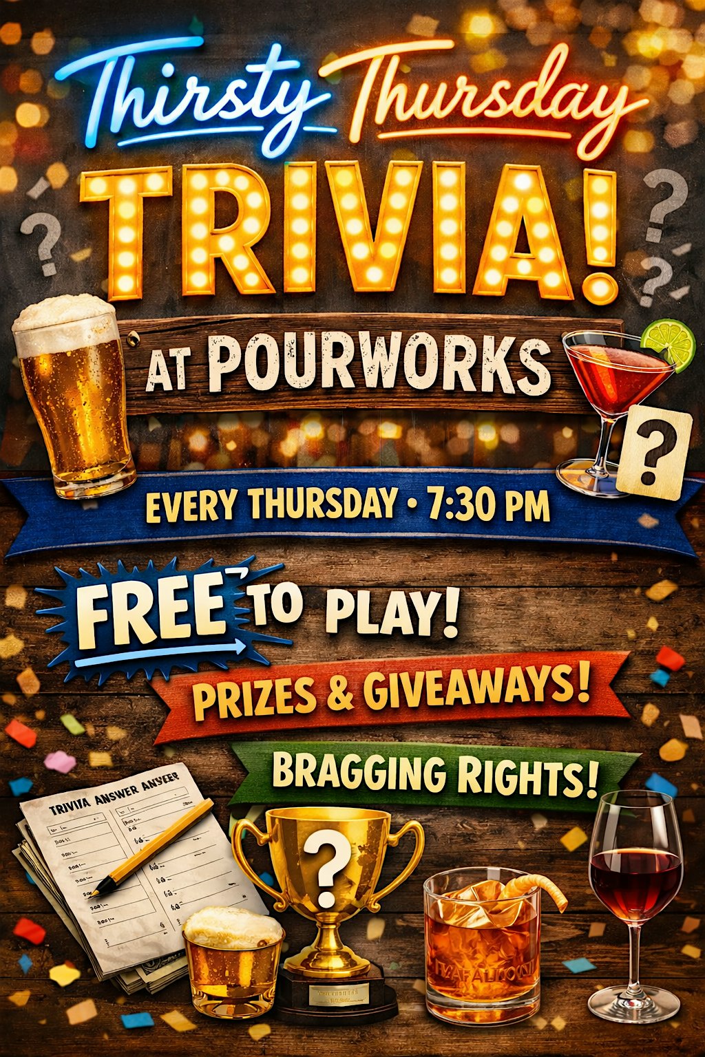 Join us for Trivia Night every Thursday at Pourworks! Compete for prizes and bragging rights! FREE TO PLAY!
