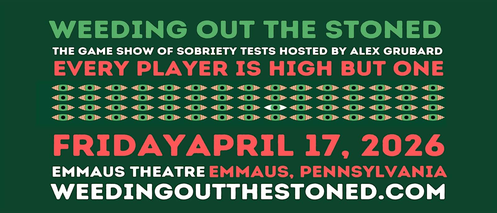 by admin14Feb Weeding Out The Stoned (Happy 420 Edition) at The Emmaus Theatre – Emmaus, PA Weeding Out The Stoned (Happy 420 Edition) at The Emmaus Theatre – Emmaus, PA 1 1 people viewed this event. Weeding Out The Stoned is The Game Show of Sobriety Tests. Tickets-RSVP Link Date And Time Friday, April 17th, 2026 11:00 PM (PST) Venue The Emmaus Theatre Location 19 s 4th street, Emmaus, PA 18049 Event Types Concert or PerformancePerforming & Visual Arts Event Category Pennsylvania Share With Friends Facebook Twitter Linkedin Xing Pinterest Share This Post: