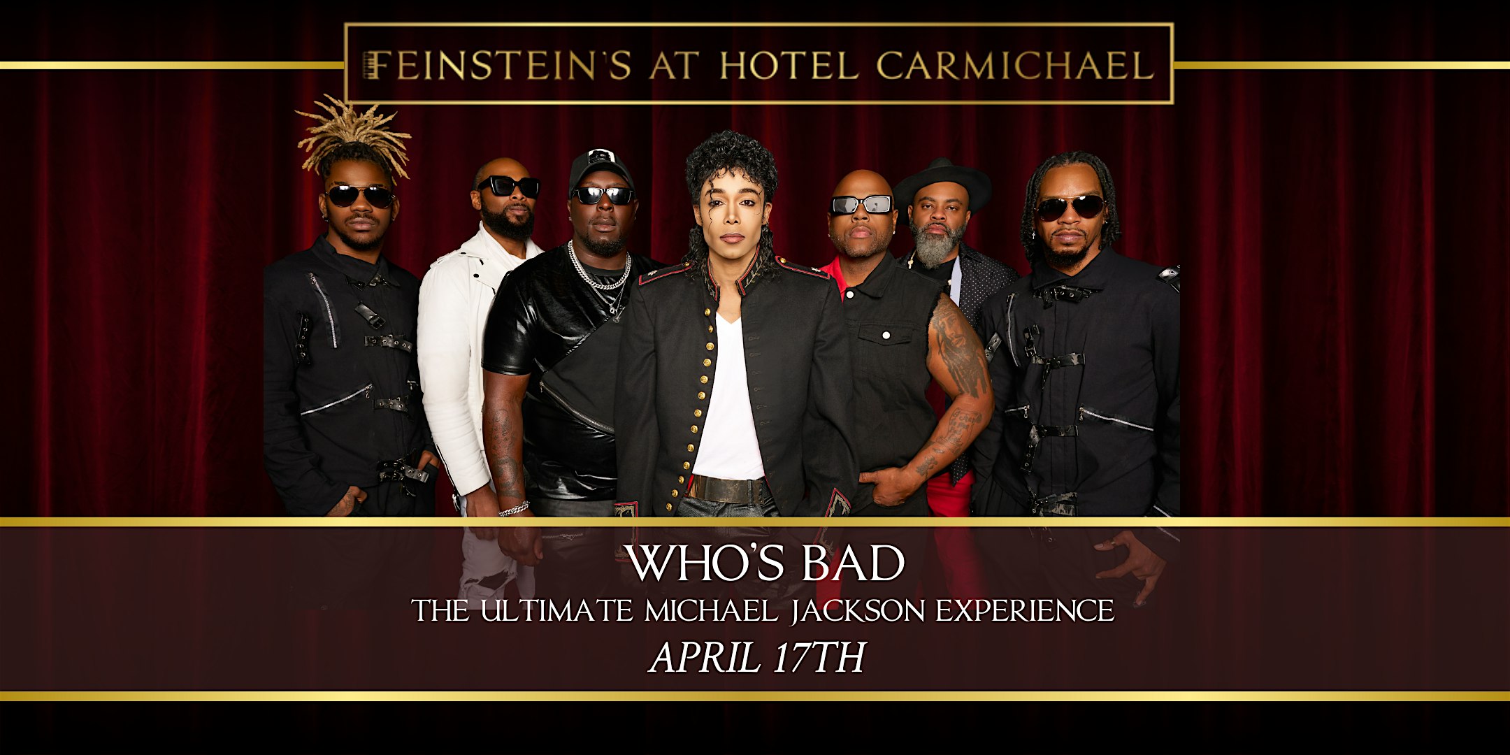 by admin24Feb WHO’S BAD: The Ultimate Michael Jackson Experience at Feinstein’s at Hotel Carmichael – Carmel, IN WHO’S BAD: The Ultimate Michael Jackson Experience at Feinstein’s at Hotel Carmichael – Carmel, IN 3 3 people viewed this event. WHO’S BAD is a unrivaled celebration of pop music’s one true King… Michael Jackson Tickets-RSVP Link Date And Time Friday, April 17th, 2026 07:00 PM (PST) Venue Feinstein's at Hotel Carmichael Location 1 Carmichael Square, Carmel, IN 46032 Event Types Concert or PerformanceMusic Event Category Indiana Share With Friends Facebook Twitter Linkedin Xing Pinterest Share This Post: