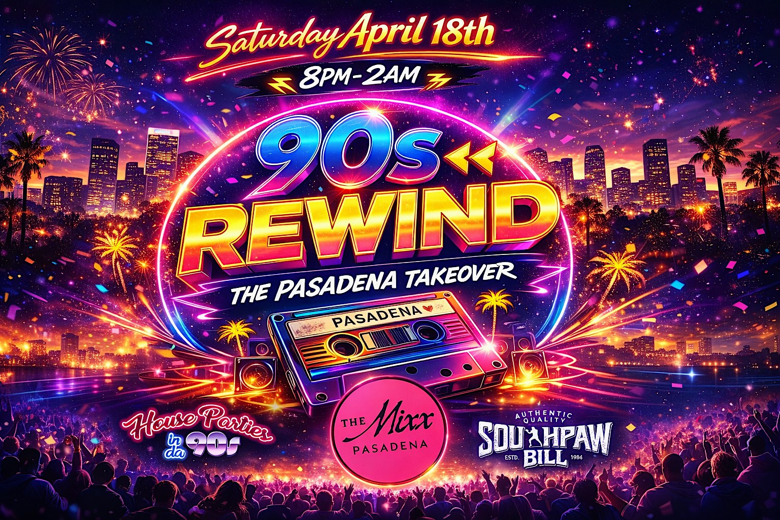 by admin27Feb 90s REWIND-PASADENA TAKE OVER at The Mixx – Pasadena, CA 90s REWIND-PASADENA TAKE OVER at The Mixx – Pasadena, CA 2 2 people viewed this event. Get ready to party old school with 90s REWIND — all your fave hits, vibes, and throwback fun live! Tickets-RSVP Link Date And Time Saturday, April 18th, 2026 @ 08:00 PM Location 443 East Colorado Boulevard, Pasadena, CA 91101 Event Types MusicParty or Social Gathering Event Category California Share With Friends Facebook Twitter Linkedin Xing Pinterest Share This Post: