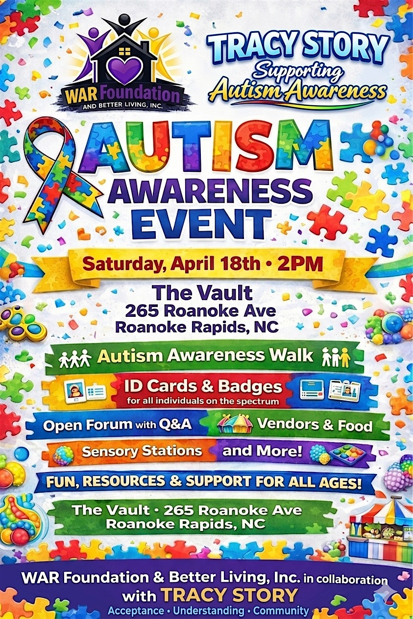 Autism Awareness Event at 265 Roanoke Ave – Roanoke Rapids, NC Autism Awareness Event at 265 Roanoke Ave – Roanoke Rapids, NC 5 5 people viewed this event. Join us for a fun Autism Awareness Walk, resources, sensory stations, food, and support for all ages! Building understanding together. Tickets-RSVP Link Register for event Date And Time Saturday, April 18th, 2026 @ 02:00 PM Location 265 Roanoke Avenue, Roanoke Rapids, NC 27870 Event Types Charity & CausesRally Event Category North Carolina Share With Friends Facebook Twitter Linkedin Xing Pinterest