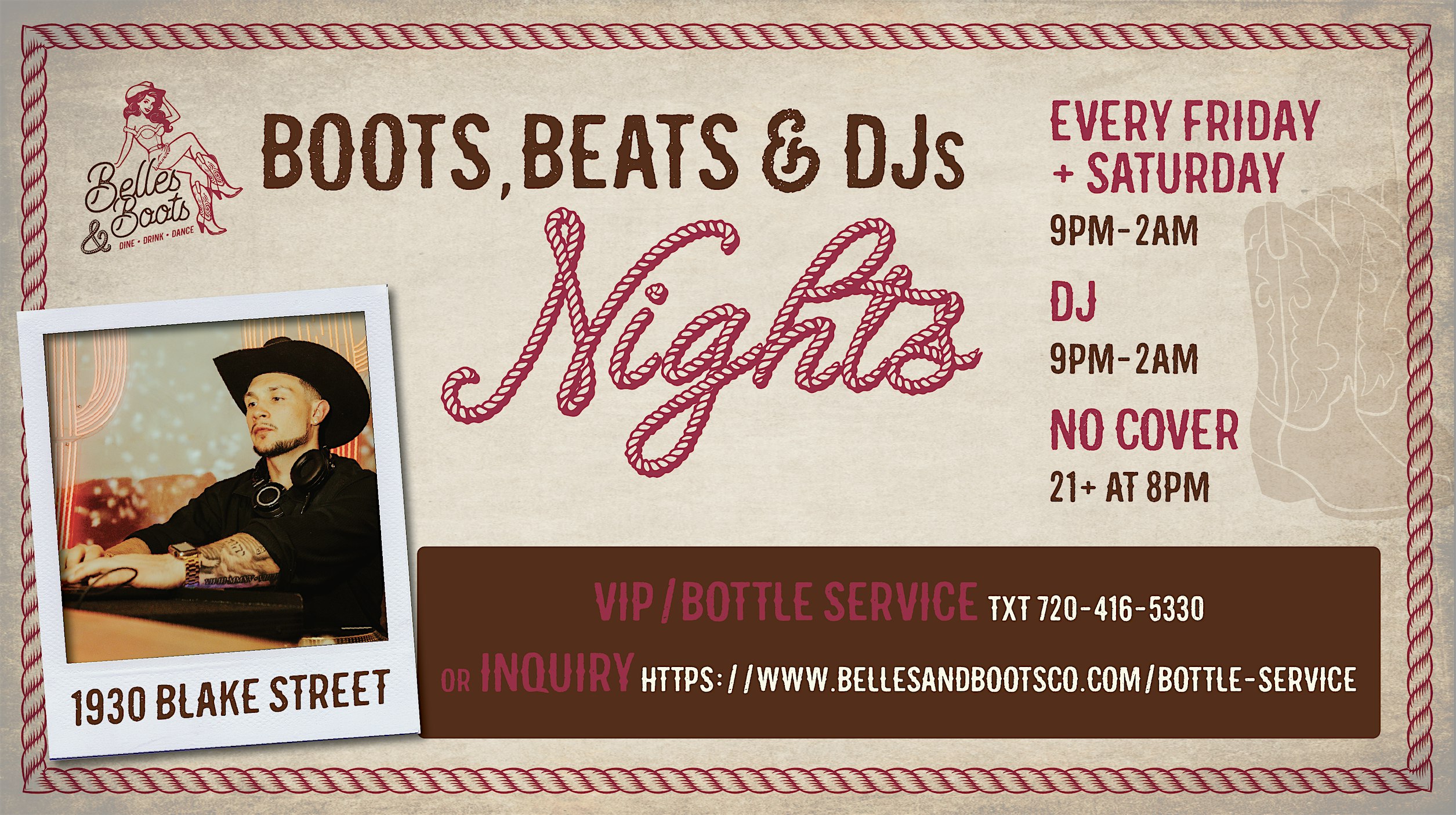 by admin24Feb Boots, Beats, & DJs at Belles & Boots – Denver, CO Boots, Beats, & DJs at Belles & Boots – Denver, CO 1 1 people viewed this event. Boots, Beats, & DJs at Belles & Boots Tickets-RSVP Link Date And Time Saturday, April 18th, 2026 09:00 PM (PST) Venue Belles & Boots Location 1930 Blake Street, Denver, CO 80202 Event Types Concert or PerformanceMusic Event Category ColoradoDenver Share With Friends Facebook Twitter Linkedin Xing Pinterest Share This Post: