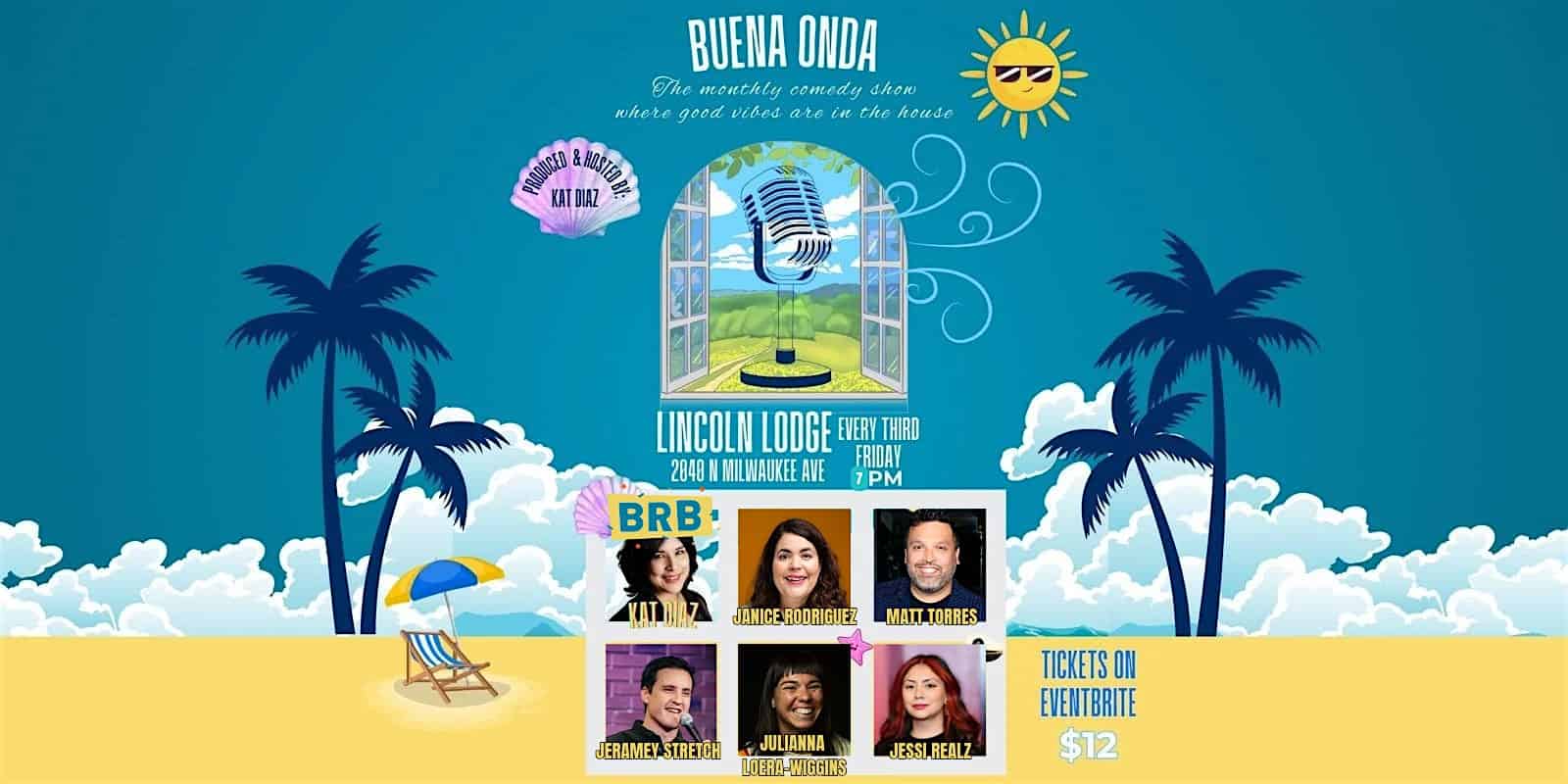by admin14Feb Buena Onda Comedy at The Lincoln Lodge – Chicago, IL Buena Onda Comedy at The Lincoln Lodge – Chicago, IL 1 1 people viewed this event. A stand-up show focused on highlighting Latin comedic talent and good vibes! Tickets-RSVP Link Date And Time Saturday, April 18th, 2026 12:00 AM (PST) Venue The Lincoln Lodge Location 2040 North Milwaukee Avenue, Chicago, IL 60647 Event Types Concert or PerformancePerforming & Visual Arts Event Category ChicagoIllinois Share With Friends Facebook Twitter Linkedin Xing Pinterest Share This Post: