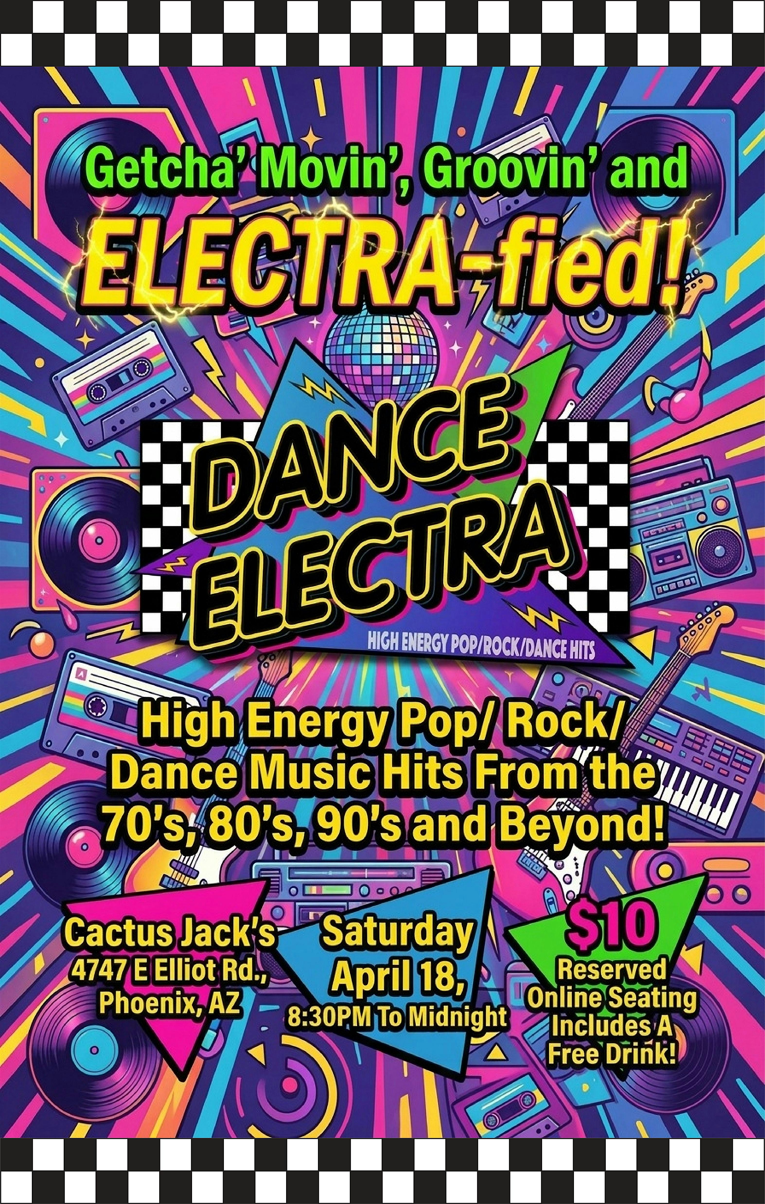 Dance Electra @ CactusJacks Saturday April 18th at Cactus Jack’s Bar & Grill – Phoenix, AZ Dance Electra @ CactusJacks Saturday April 18th at Cactus Jack’s Bar & Grill – Phoenix, AZ 3 3 people viewed this event. PHOENIX!! Dance Electra LIVE @ CactusJacks SAT 4/18! Show starts @ 8:30p RSVP only $10 w/ Free Drink! More info text 602-559-8393 Tickets-RSVP Link Register for event Date And Time Saturday, April 18th, 2026 @ 08:00 PM Location 4747 East Elliot Road, Phoenix, AZ 85044 Event Types Concert or PerformanceMusic Event Category ArizonaPhoenix Share With Friends Facebook Twitter Linkedin Xing Pinterest