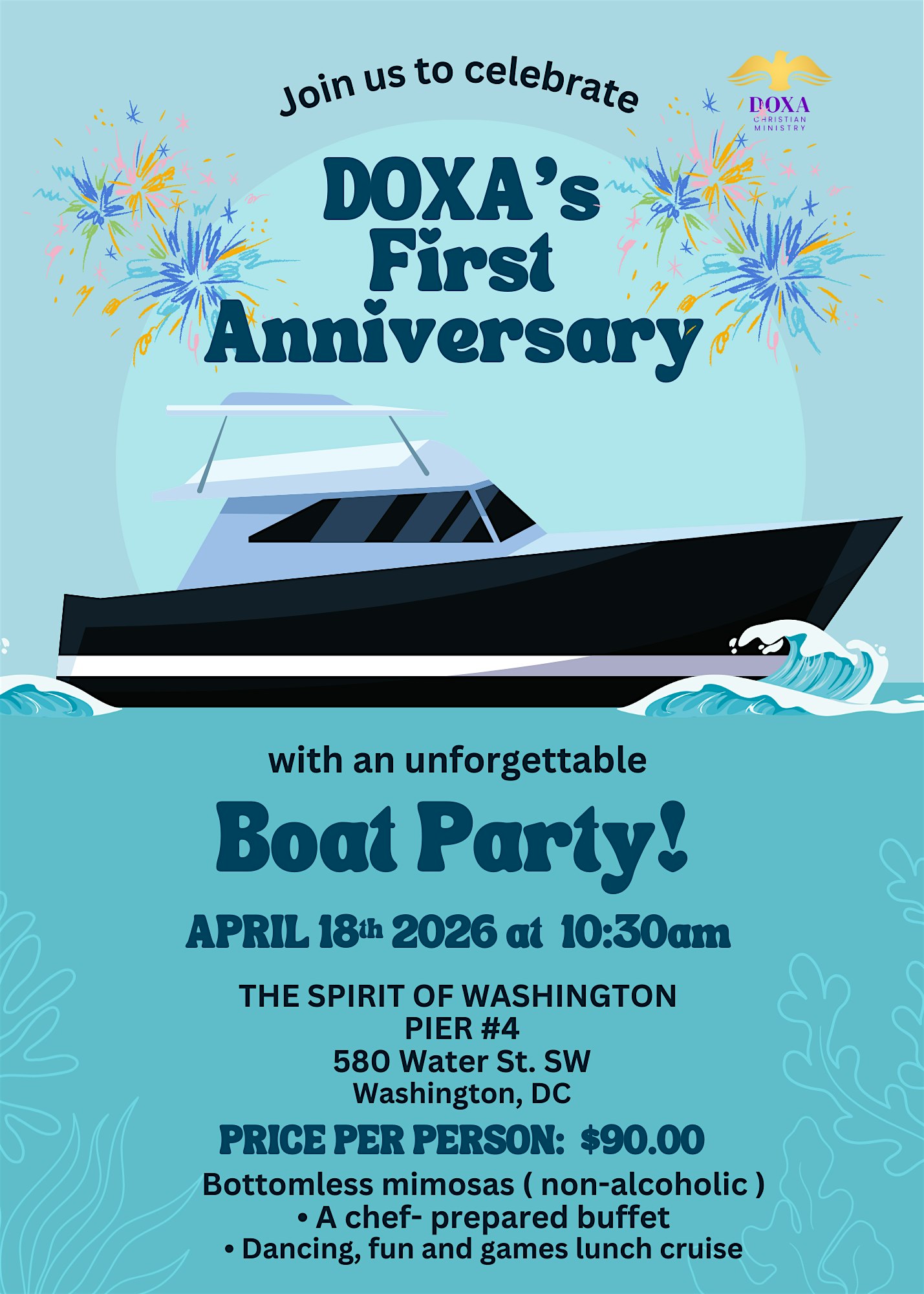 Doxa Boat Cruise at 580 Water St SW – Washington, DC Doxa Boat Cruise at 580 Water St SW – Washington, DC 2 2 people viewed this event. Join us on a special anniversary cruise as we celebrate one year of Doxa—faith, family, and unforgettable moments at sea. Tickets-RSVP Link Register for event Date And Time Saturday, April 18th, 2026 @ 10:00 AM Location 580 Water Street Southwest, Washington, DC 20024 Event Types Party or Social Gathering Event Category Washington DC Share With Friends Facebook Twitter Linkedin Xing Pinterest
