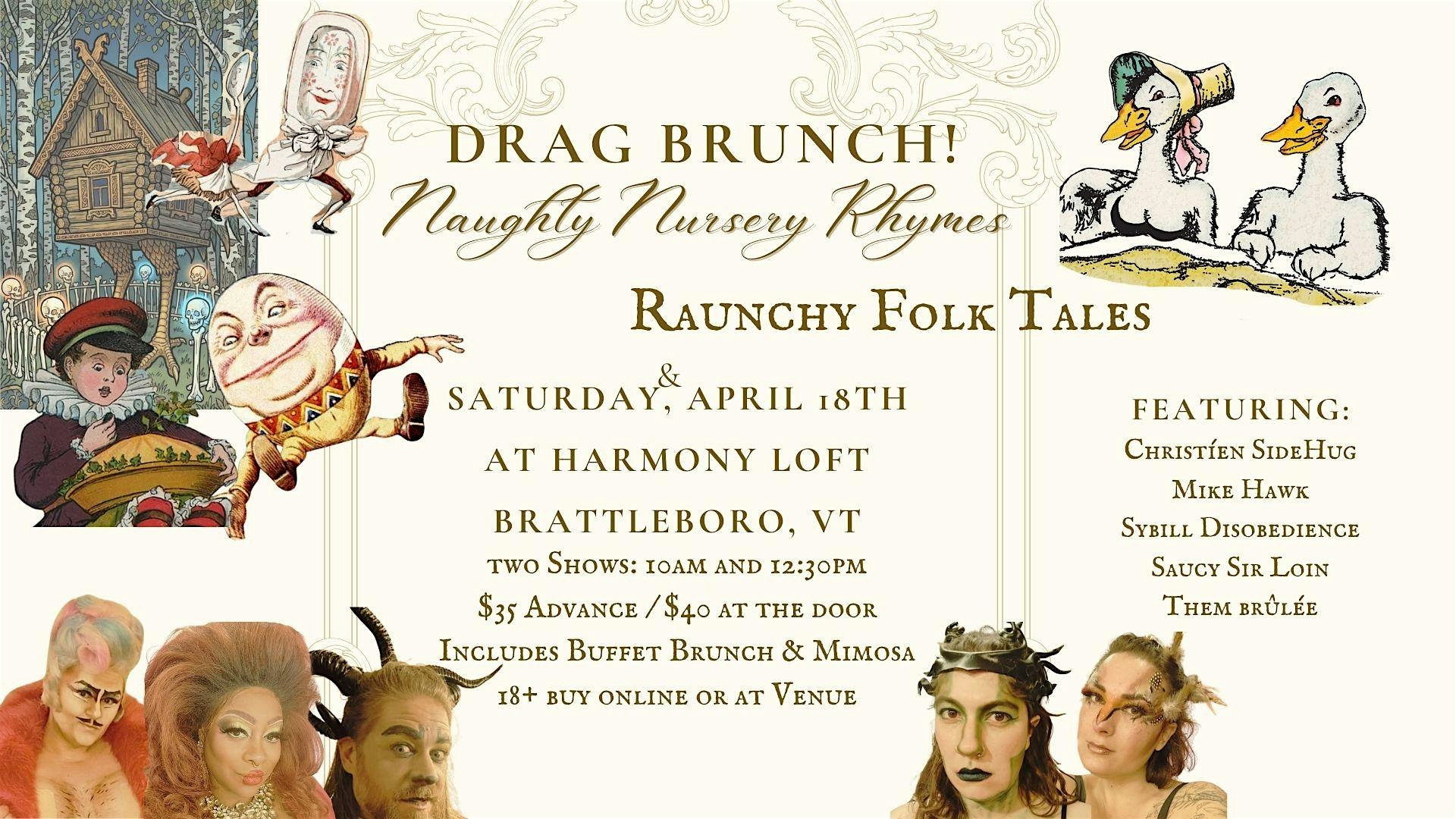 DRAG BRUNCH – Naughty Nursery Rhymes & Raunchy Folk Tales at Harmony Loft – Brattleboro, VT DRAG BRUNCH – Naughty Nursery Rhymes & Raunchy Folk Tales at Harmony Loft – Brattleboro, VT 3 3 people viewed this event. Brunch with Drag Performances at Harmony Loft! Tickets-RSVP Link Register for event Date And Time Saturday, April 18th, 2026 @ 10:00 AM Location 44 Harmony Place, Brattleboro, VT 5301 Event Types Concert or PerformancePerforming & Visual Arts Event Category Vermont Share With Friends Facebook Twitter Linkedin Xing Pinterest