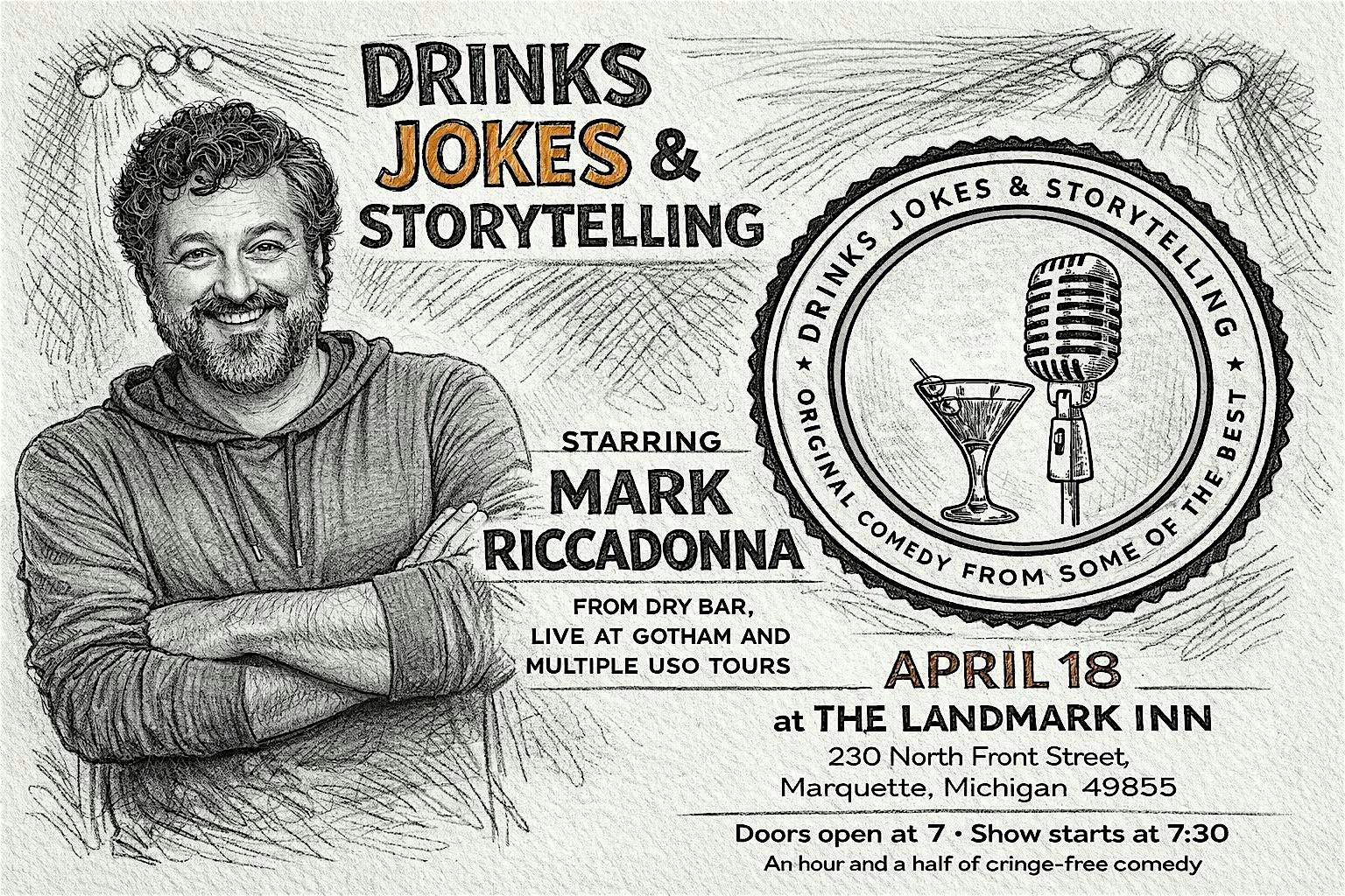 by admin13Feb Drinks Jokes and Storytelling with Mark Riccadonna at Landmark Inn – Marquette, MI Drinks Jokes and Storytelling with Mark Riccadonna at Landmark Inn – Marquette, MI 2 2 people viewed this event. Join Comedian Mark Riccadonna for a fun night full of drinks, laughs, and epic storytelling in person! Tickets-RSVP Link Date And Time Saturday, April 18th, 2026 11:00 PM (PST) Venue Landmark Inn Location 230 North Front Street, Marquette, MI 49855 Event Types Food & DrinkParty or Social Gathering Event Category Michigan Share With Friends Facebook Twitter Linkedin Xing Pinterest Share This Post: