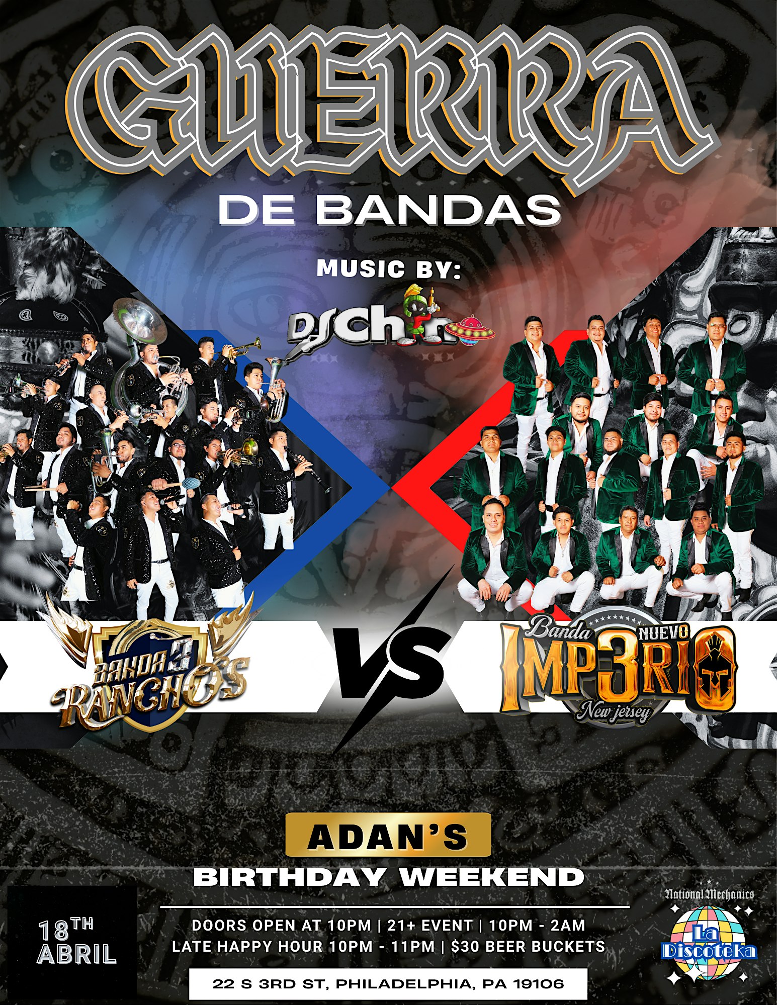 Guerra de Bandas at National Mechanics Bar and Restaurant – Philadelphia, PA Guerra de Bandas at National Mechanics Bar and Restaurant – Philadelphia, PA 3 3 people viewed this event. Prepárate para una batalla épica de bandas donde la música y la energía se apoderan del lugar. Tickets-RSVP Link Register for event Date And Time Saturday, April 18th, 2026 @ 10:00 PM Location 22 South 3rd Street, Philadelphia, PA 19106 Event Types MusicParty or Social Gathering Event Category PennsylvaniaPhiladelphia Share With Friends Facebook Twitter Linkedin Xing Pinterest