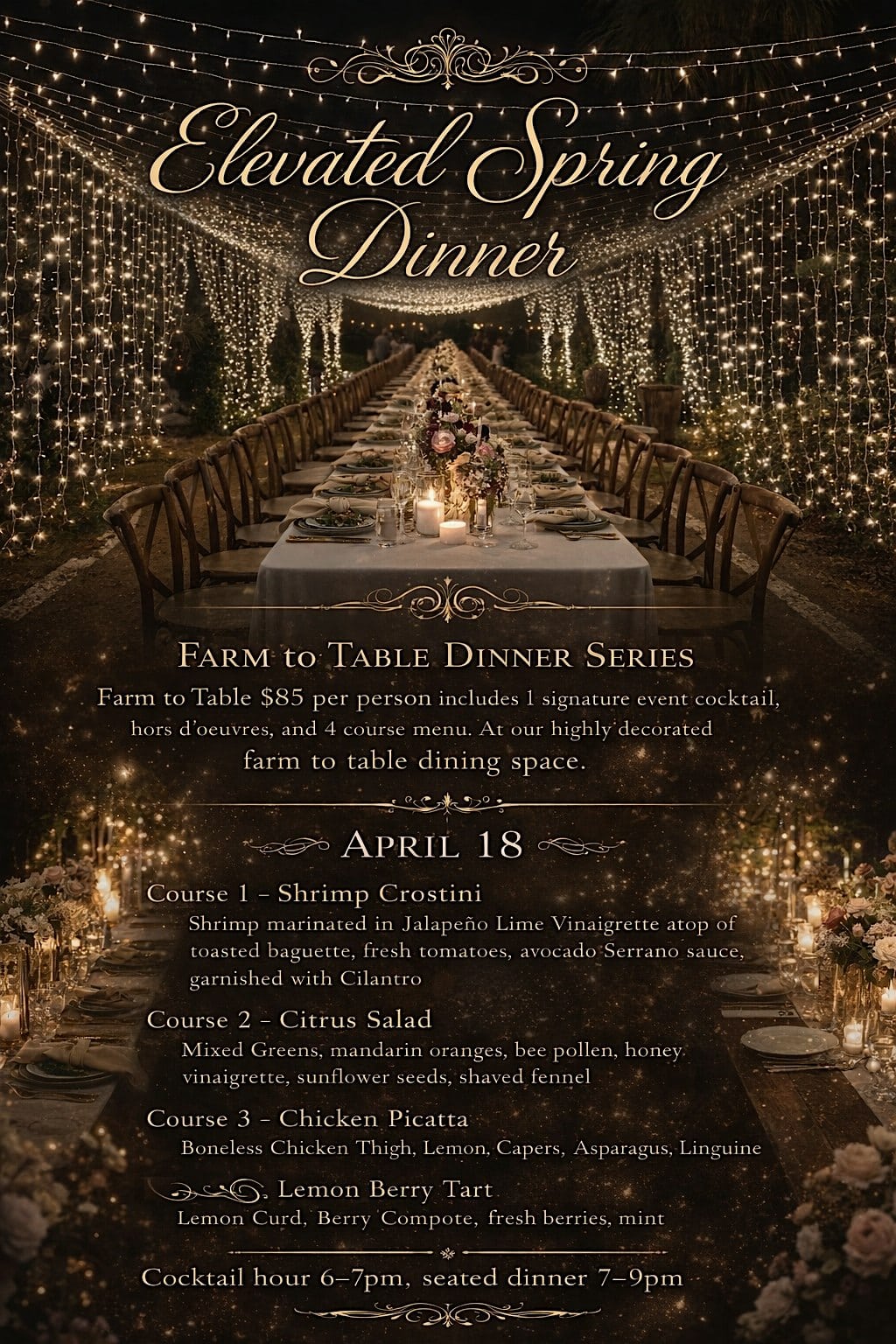 by admin14Feb Hive to Table – “Elevated Farm to Table “Dining Experience at Anchor Allie’s Fayetteville – Fayetteville, NC Hive to Table – “Elevated Farm to Table “Dining Experience at Anchor Allie’s Fayetteville – Fayetteville, NC 1 1 people viewed this event. A magical farm-to-table spring dinner featuring cocktail hour, hors d’oeuvres, and a four-course chef-curated experience. Tickets-RSVP Link Date And Time Saturday, April 18th, 2026 10:00 PM (PST) Venue Anchor Allie’s Fayetteville Location 1204 Bragg Boulevard, Fayetteville, NC 28301 Event Types Food & Drink Event Category North Carolina Share With Friends Facebook Twitter Linkedin Xing Pinterest Share This Post: