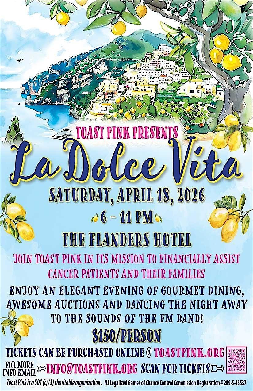 by admin13Feb La Dolce Vita at The Flanders Hotel – Ocean City, NJ La Dolce Vita at The Flanders Hotel – Ocean City, NJ 1 1 people viewed this event. Join Toast Pink for an elegant evening in support of its mission to financially assist cancer patients and their families. Tickets-RSVP Link Date And Time Saturday, April 18th, 2026 10:00 PM (PST) Venue The Flanders Hotel Location 719 East 11th Street, Ocean City, NJ 8226 Event Types Food & DrinkParty or Social Gathering Event Category New Jersey Share With Friends Facebook Twitter Linkedin Xing Pinterest Share This Post: