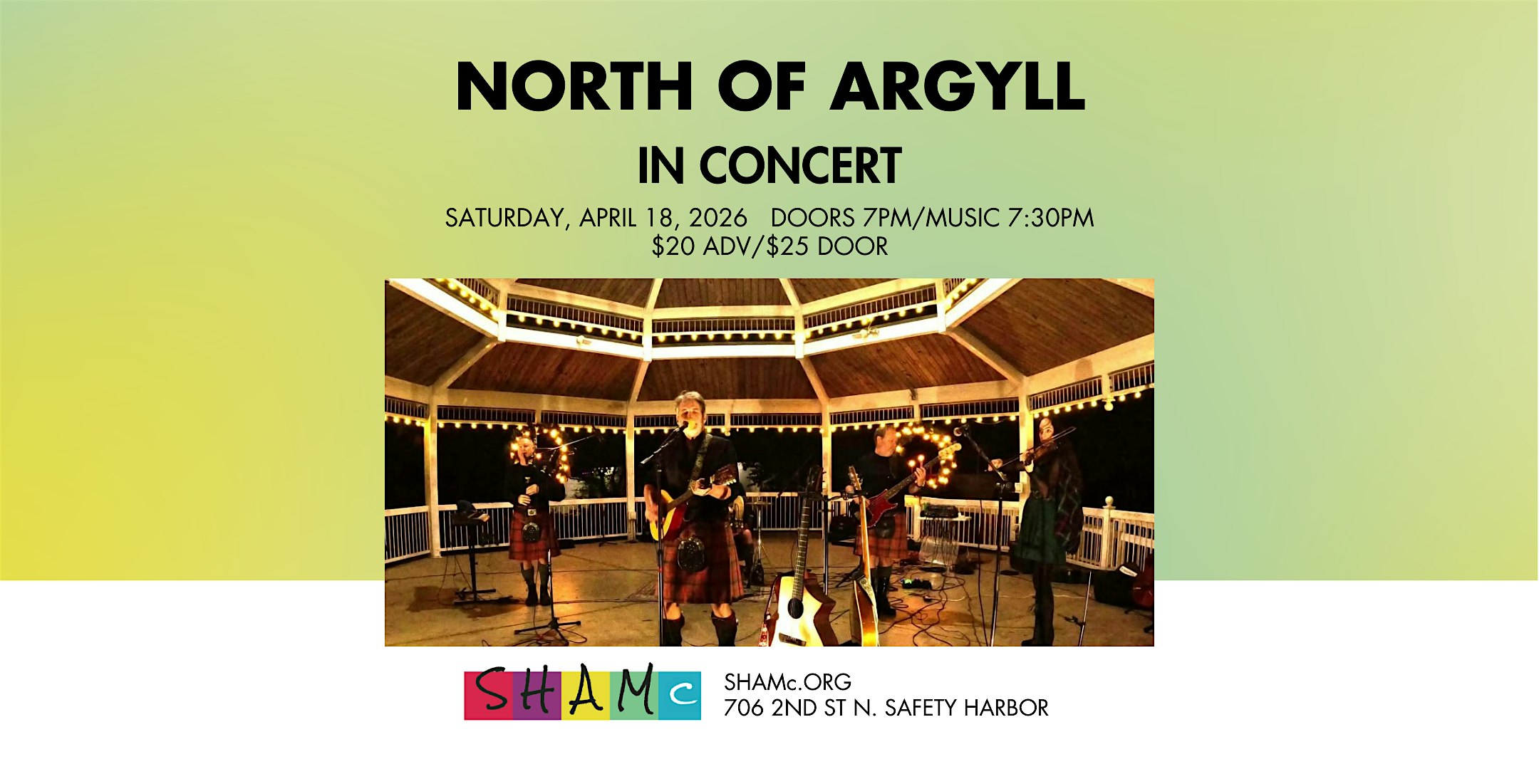 by admin24Feb North of Argyll In Concert at Safety Harbor Art And Music Center – Safety Harbor, FL North of Argyll In Concert at Safety Harbor Art And Music Center – Safety Harbor, FL 2 2 people viewed this event. See Scottish/Celtic fusion band North of Argyll at the Safety Harbor Art And Music Center – it’s going to be a night to remember! Tickets-RSVP Link Date And Time Saturday, April 18th, 2026 07:00 PM (PST) Venue Safety Harbor Art And Music Center Location 706 2nd Street North, Safety Harbor, FL 34695 Event Types Concert or PerformanceMusic Event Category ClearwaterFlorida Share With Friends Facebook Twitter Linkedin Xing Pinterest Share This Post: