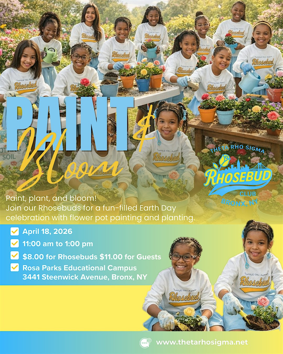 by admin13Feb Paint & Bloom Fundraiser at 3441 Steenwick Ave – The Bronx, NY Paint & Bloom Fundraiser at 3441 Steenwick Ave – The Bronx, NY 1 1 people viewed this event. The Sigma Gamma Rho Sorority, Inc. – Theta Rho Sigma Bronx Alumnae Chapter is excited to invite our Rhosebuds and friends to Paint & Bloom, Tickets-RSVP Link Date And Time Saturday, April 18th, 2026 03:00 PM (PST) Venue 3441 Steenwick Ave Location 3441 Steenwick Avenue, The Bronx, NY 10475 Event Types Party or Social Gathering Event Category New YorkNew York City Share With Friends Facebook Twitter Linkedin Xing Pinterest Share This Post: