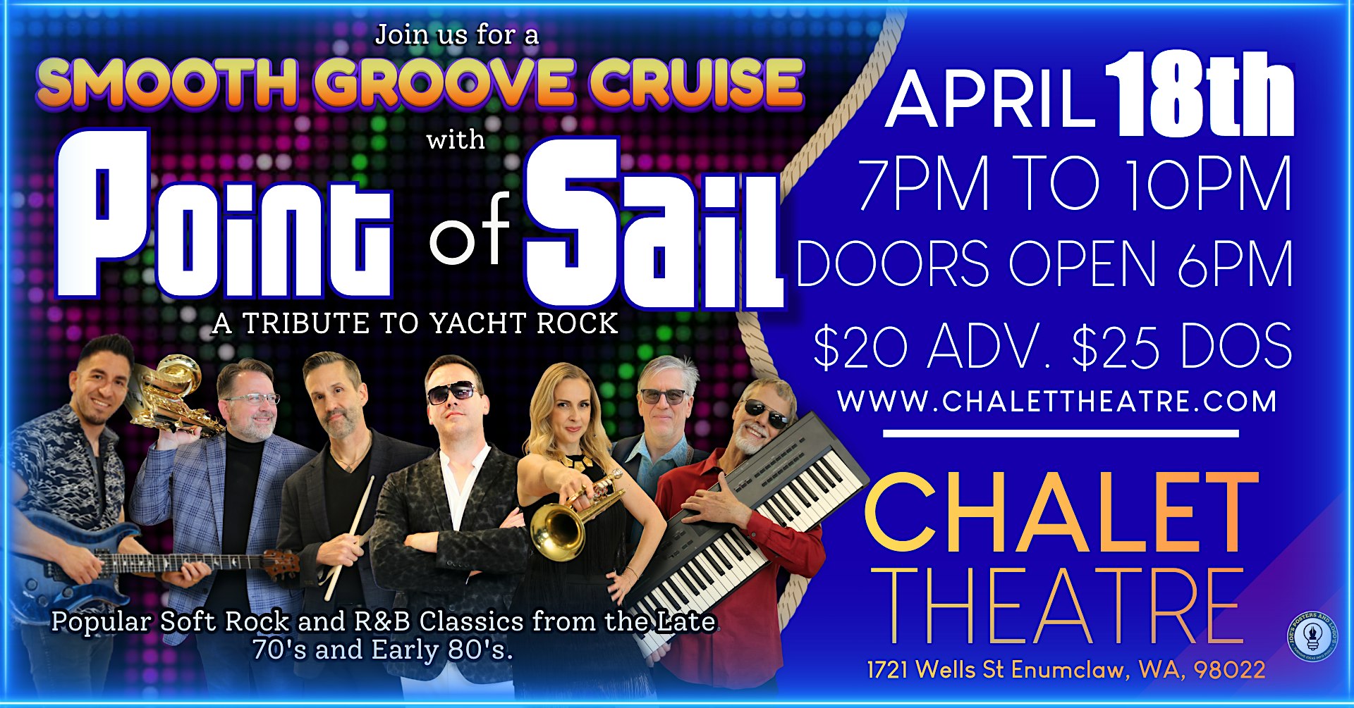 by admin24Feb POINT OF SAIL at Chalet Theatre – Enumclaw, WA POINT OF SAIL at Chalet Theatre – Enumclaw, WA 1 1 people viewed this event. A TRIBUTE TO 70’S AND 80’S YACHT ROCK HITS Tickets-RSVP Link Date And Time Saturday, April 18th, 2026 07:00 PM (PST) Venue Chalet Theatre Location 1721 Wells Street, Enumclaw, WA 98022 Event Types Concert or PerformanceMusic Event Category Washington Share With Friends Facebook Twitter Linkedin Xing Pinterest Share This Post:
