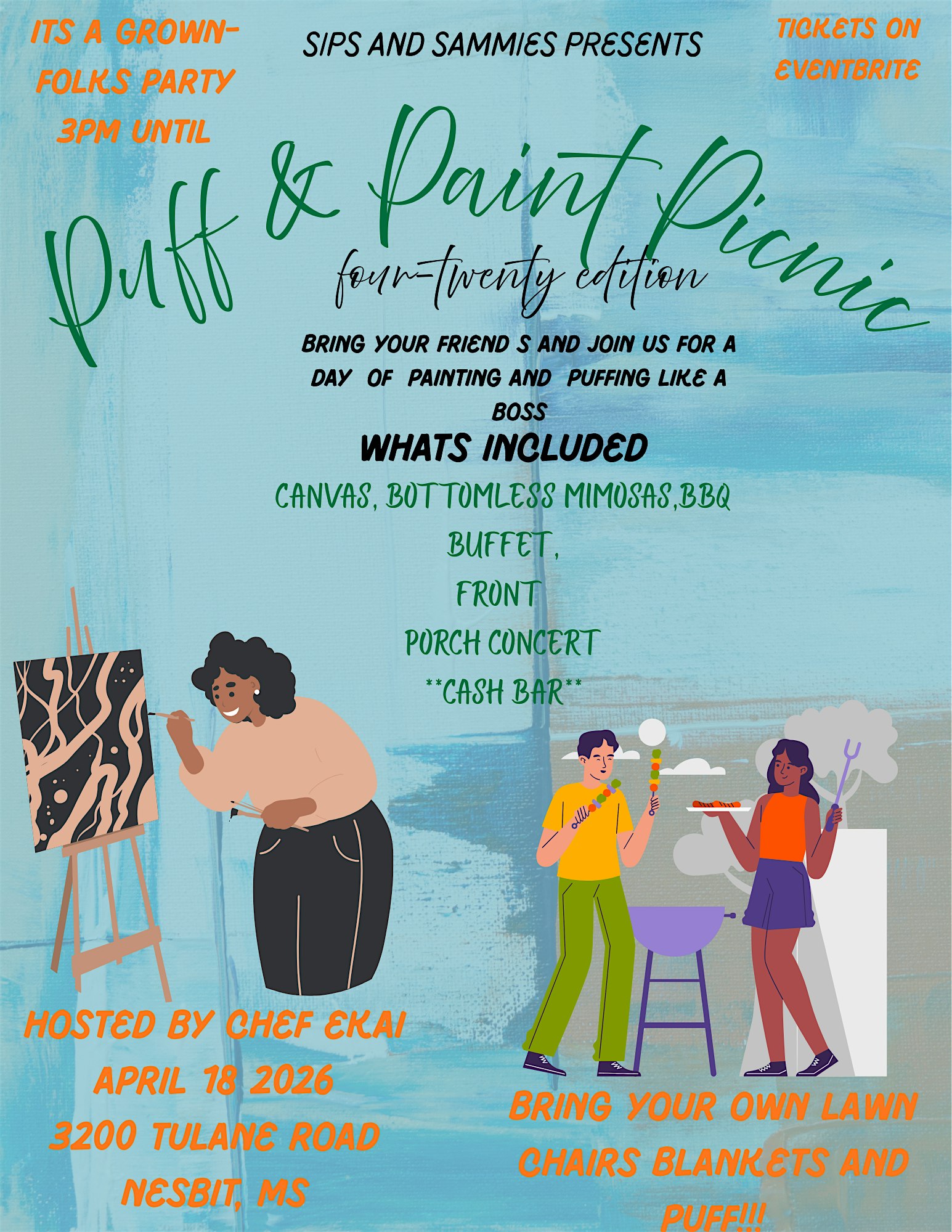 Puff & Paint Picnic at 3300 Tulane Rd – Memphis, TN Puff & Paint Picnic at 3300 Tulane Rd – Memphis, TN 4 4 people viewed this event. We are kicking of Spring with a Grown-folks Event that takes this Paint & Sip to a whole new level!!! Bring your fav smoke and Let’s Vibe! Tickets-RSVP Link Register for event Date And Time Saturday, April 18th, 2026 @ 03:00 PM Location 3300 Tulane Road, Memphis, TN 38116 Event Types Party or Social GatheringPerforming & Visual Arts Event Category MemphisTennessee Share With Friends Facebook Twitter Linkedin Xing Pinterest