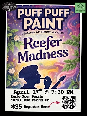 by admin13Feb Puff Puff Paint: Reefer Madness at The Derby Room Perris – Perris, CA Puff Puff Paint: Reefer Madness at The Derby Room Perris – Perris, CA 1 1 people viewed this event. Enjoy elevated vibes, great music, and a welcoming space where creativity flows freely- no experience needed. Come solo or with your crew Tickets-RSVP Link Date And Time Saturday, April 18th, 2026 02:00 AM (PST) Venue The Derby Room Perris Location 18700 Lake Perris Drive, Perris, CA 92571 Event Types Party or Social GatheringPerforming & Visual Arts Event Category California Share With Friends Facebook Twitter Linkedin Xing Pinterest Share This Post: