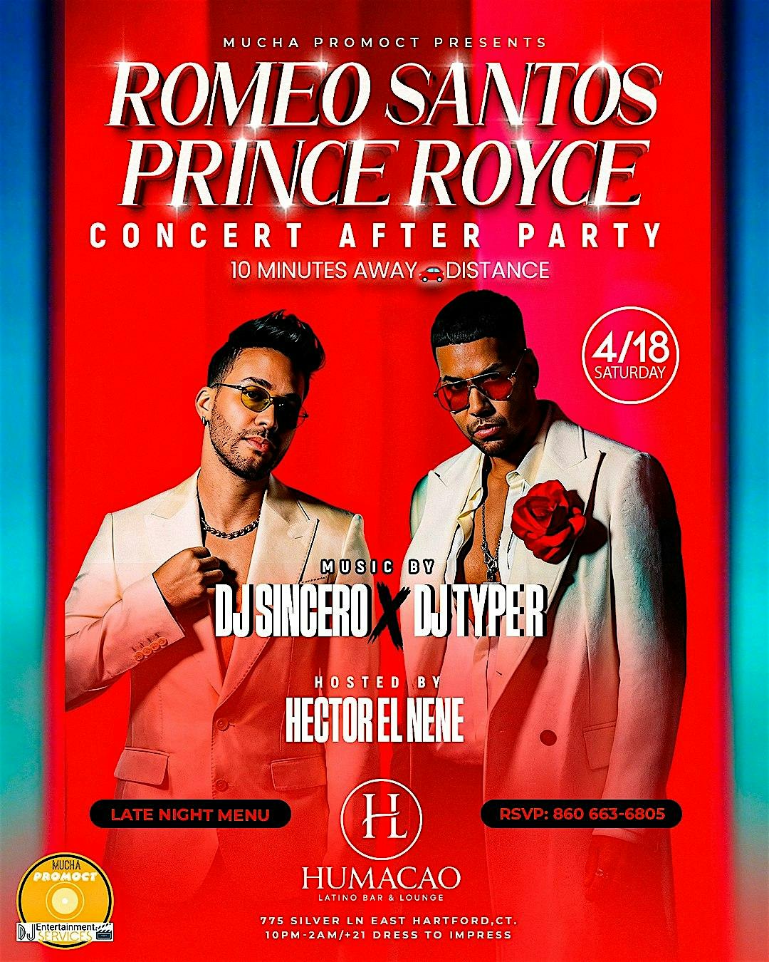 ROMEO SANTOS & PRINCE ROYCE CONCERT AFTER PARTY @ HUMACAO LOUNGE SAT 4/18! at Humacao Restaurant & Lounge – East Hartford, CT ROMEO SANTOS & PRINCE ROYCE CONCERT AFTER PARTY @ HUMACAO LOUNGE SAT 4/18! at Humacao Restaurant & Lounge – East Hartford, CT 2 2 people viewed this event. Mucha Promo Ct Presents: The Romeo Santos & Prince Royce “Concert After Party” Saturday April 18th! @ Humacao Restaurant & Lounge Tickets-RSVP Link Register for event Date And Time Saturday, April 18th, 2026 @ 10:00 PM Location 775 Silver Lane, East Hartford, CT 6118 Event Types MusicParty or Social Gathering Event Category ConnecticutHartford Share With Friends Facebook Twitter Linkedin Xing Pinterest