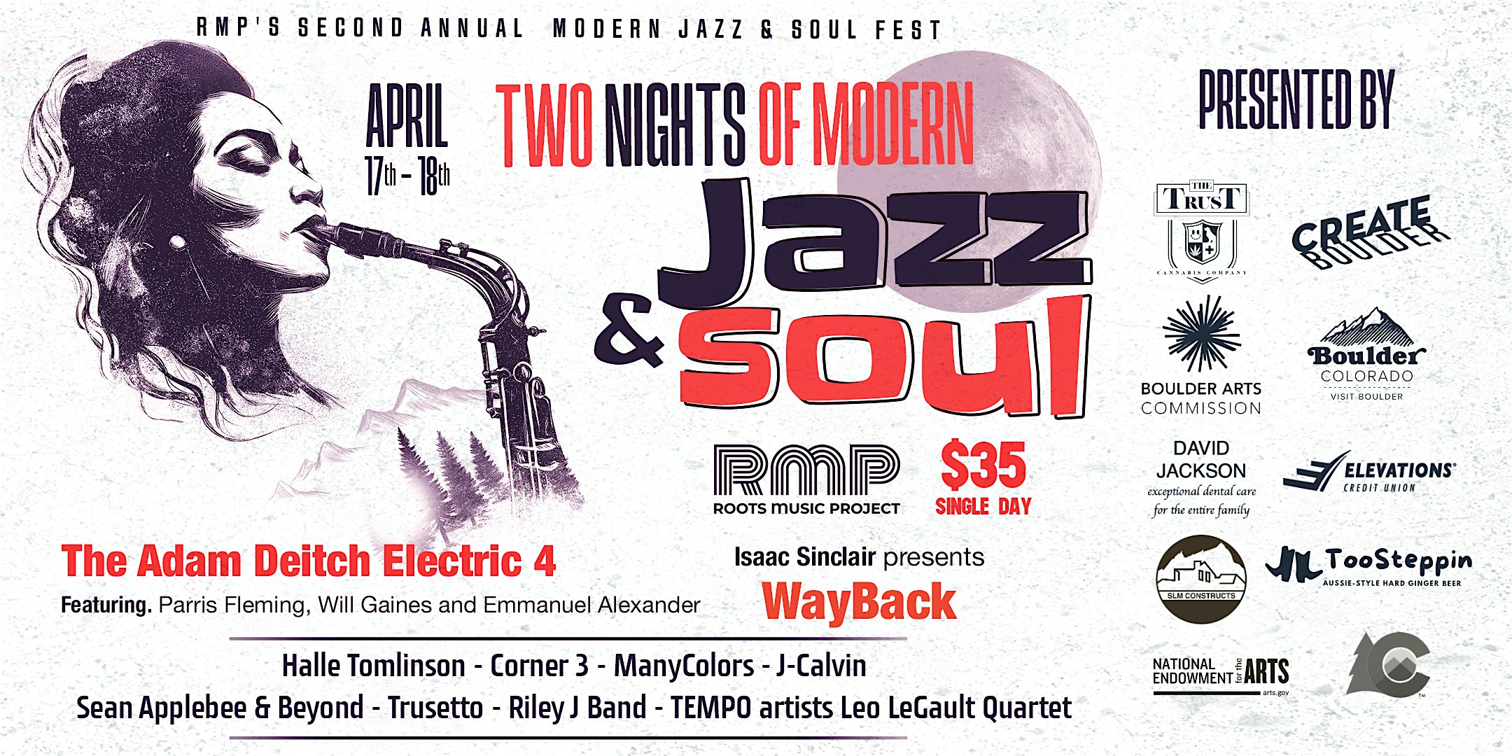 Friday night’s headliner features Isaac Sinclair presents WayBack, led by Isaac Teal of the nationally touring band TAUK. Known for his powerful vocals and dynamic stage presence, Teal brings a fresh yet rooted approach to soul and improvisational music. Friday’s lineup also includes ManyColors, Trusetto, Riley J Band, and the Leo LeGault Quartet, a featured ensemble from RMP’s TEMPO youth training program showcasing Boulder’s next generation of jazz artists.