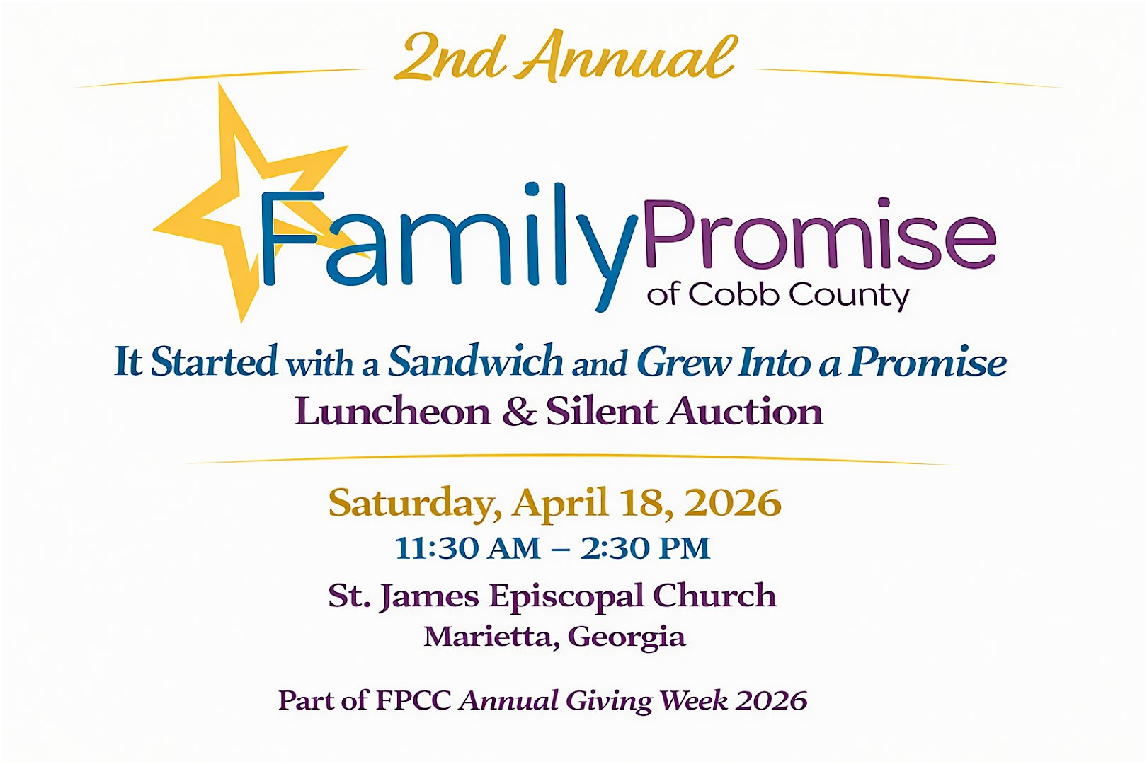 by admin24Feb Second Annual It Started with a Sandwich Luncheon and Silent Auction at St. James Episcopal Church – Marietta, GA Second Annual It Started with a Sandwich Luncheon and Silent Auction at St. James Episcopal Church – Marietta, GA 1 1 people viewed this event. A Part of Family Promise of Cobb County’s 2026 Annual Giving Week Tickets-RSVP Link Date And Time Saturday, April 18th, 2026 11:00 AM (PST) Venue St. James Episcopal Church Location 161 Church Street, Marietta, GA 30060 Event Types Food & Drink Event Category AtlantaGeorgia Share With Friends Facebook Twitter Linkedin Xing Pinterest Share This Post: