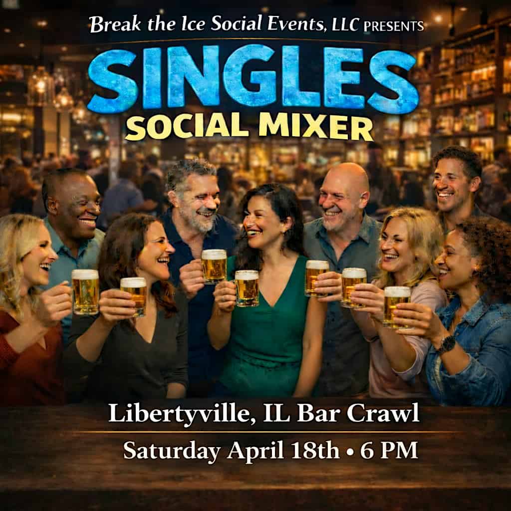 by admin23Feb Singles Social Mixer Libertyville, IL Bar Crawl Starting at Morgan’s at Morgan’s Bar & Grill – Libertyville, IL Singles Social Mixer Libertyville, IL Bar Crawl Starting at Morgan’s at Morgan’s Bar & Grill – Libertyville, IL 2 2 people viewed this event. Meet new people and hit up some cool bars for a fun night of mingling and drinks with fellow singles! Tickets-RSVP Link Date And Time Saturday, April 18th, 2026 06:00 PM (PST) Venue Morgan's Bar & Grill Location 532 North Milwaukee Avenue, Libertyville, IL 60048 Event Types Food & DrinkParty or Social Gathering Event Category Illinois Share With Friends Facebook Twitter Linkedin Xing Pinterest Share This Post: