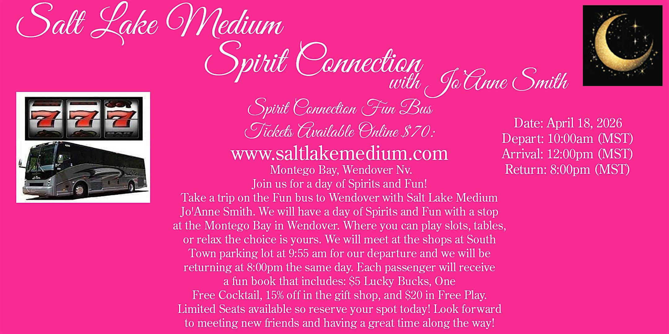 by admin27Feb “SPIRIT CONNECTION FUN BUS TO WENDOVER” W/ SALT LAKE MEDIUM, JO’ANNE SMITH at Montego Bay Hotel Casino Resort – West Wendover, NV “SPIRIT CONNECTION FUN BUS TO WENDOVER” W/ SALT LAKE MEDIUM, JO’ANNE SMITH at Montego Bay Hotel Casino Resort – West Wendover, NV 2 2 people viewed this event. Spirit messages delivered by Salt Lake Medium, Jo’Anne Smith Tickets-RSVP Link Date And Time Saturday, April 18th, 2026 @ 10:00 AM Location 100 Wendover Boulevard, West Wendover, NV 89883 Event Types OtherParty or Social Gathering Event Category Nevada Share With Friends Facebook Twitter Linkedin Xing Pinterest Share This Post: