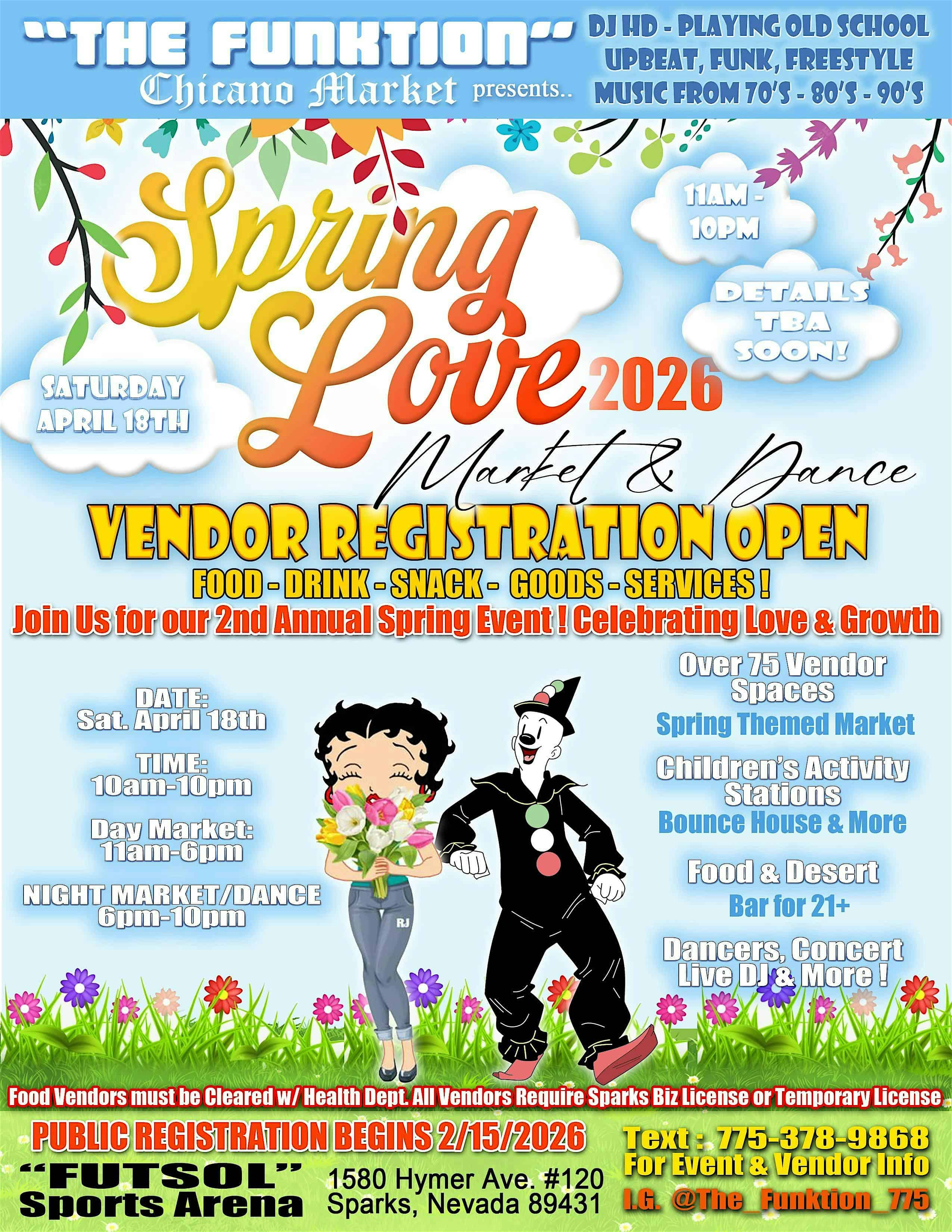 by admin23Feb SPRING LOVE Market & Dance, Presented by THE FUNKTION at Futbol Sports Arena – Sparks, NV SPRING LOVE Market & Dance, Presented by THE FUNKTION at Futbol Sports Arena – Sparks, NV 4 4 people viewed this event. A Spring-Time themed event. Celebrating Love, Life & Growth. Over 75 Vendors. Music, Food, Deserts, Dance, Concert, Dance performances +More Tickets-RSVP Link Date And Time Saturday, April 18th, 2026 11:00 AM (PST) Venue Futbol Sports Arena Location Hymer Avenue, Sparks, NV 89431 Event Types Party or Social GatheringSeasonal & Holiday Event Category NevadaReno Share With Friends Facebook Twitter Linkedin Xing Pinterest Share This Post: