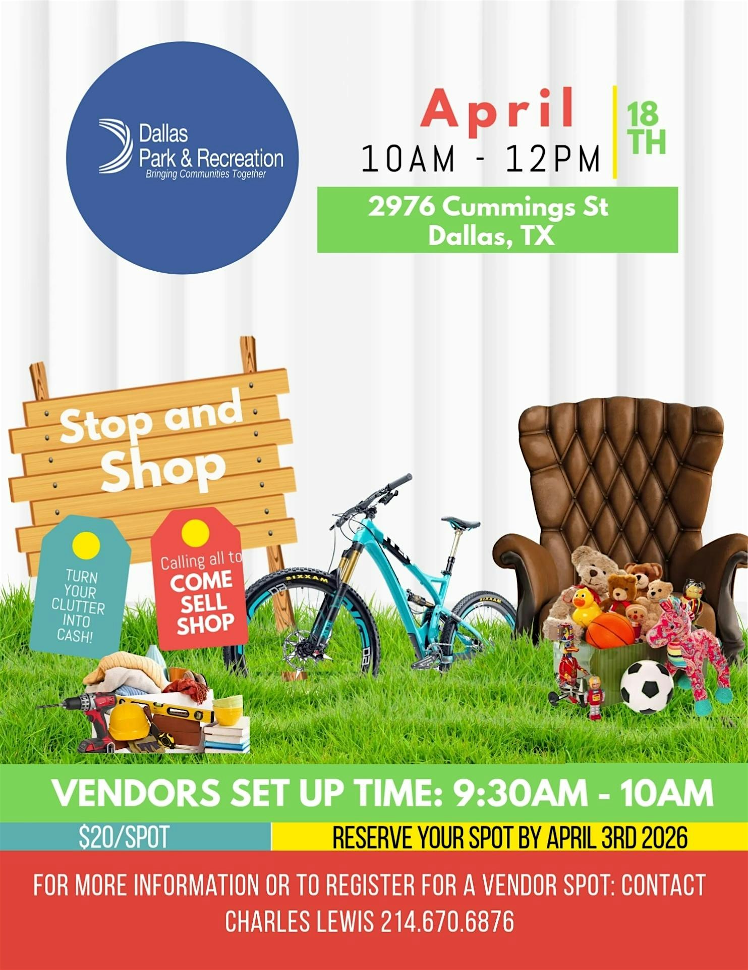 Stop and Shop at Hiawatha Recreation Center – Dallas, TX Stop and Shop at Hiawatha Recreation Center – Dallas, TX 2 2 people viewed this event. Do you have old items that could be worth something? Well come by the stop and shop and set up shop with us. Only $20 for a vendor table. Tickets-RSVP Link Register for event Date And Time Saturday, April 18th, 2026 @ 10:00 AM Location 2976 Cummings Street, Dallas, TX 75216 Event Types Community & CultureOtherParty or Social Gathering Event Category DallasTexas Share With Friends Facebook Twitter Linkedin Xing Pinterest