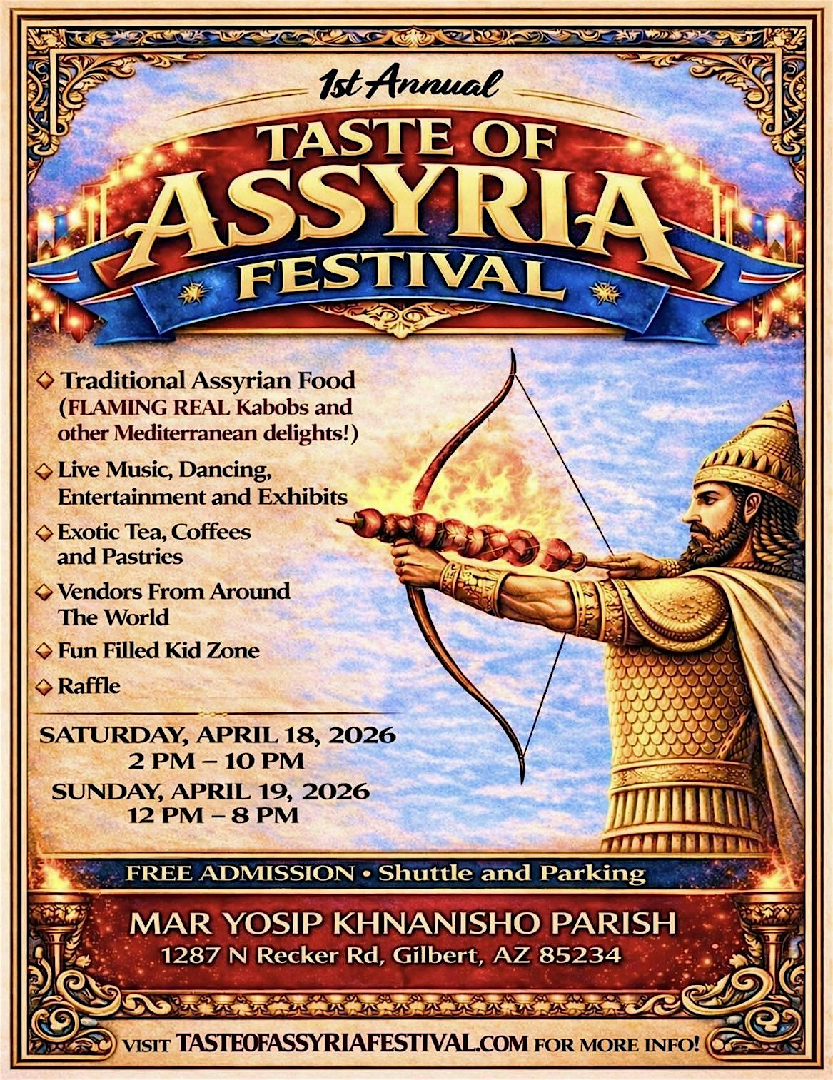 by admin27Feb Taste of Assyria Festival at Assyrian Church of the East – Mar Yosip Khnanisho Parish – Gilbert, AZ Taste of Assyria Festival at Assyrian Church of the East – Mar Yosip Khnanisho Parish – Gilbert, AZ 7 7 people viewed this event. The first-ever Taste of Assyria is set to make its debut as a dynamic, celebration of flavor, culture, and community entertainment! Tickets-RSVP Link Date And Time Saturday, April 18th, 2026 @ 02:00 PM Location 1287 N Recker Road, Gilbert, AZ 85234 Event Types Festival or FairFood & Drink Event Category Arizona Share With Friends Facebook Twitter Linkedin Xing Pinterest Share This Post: